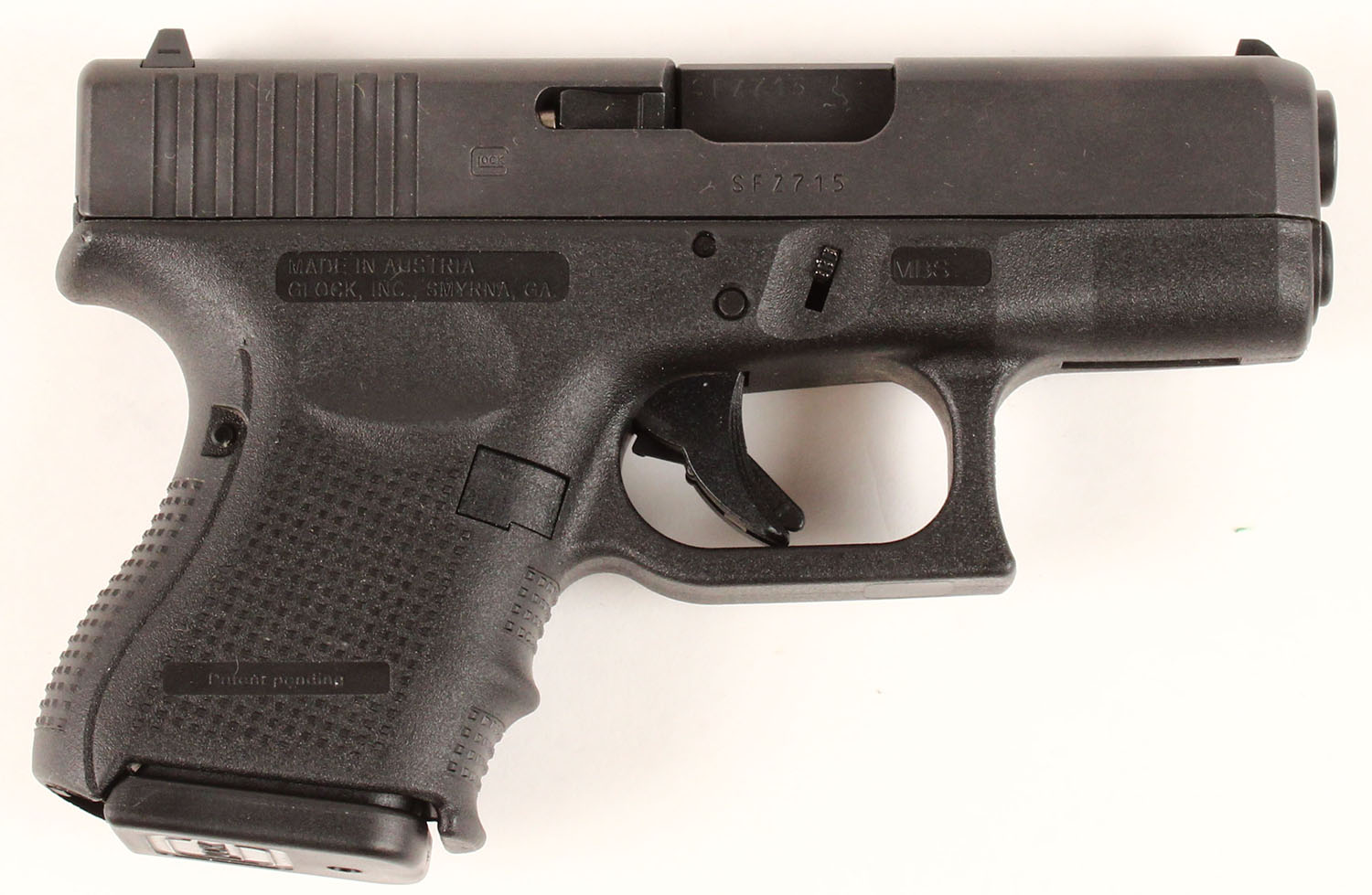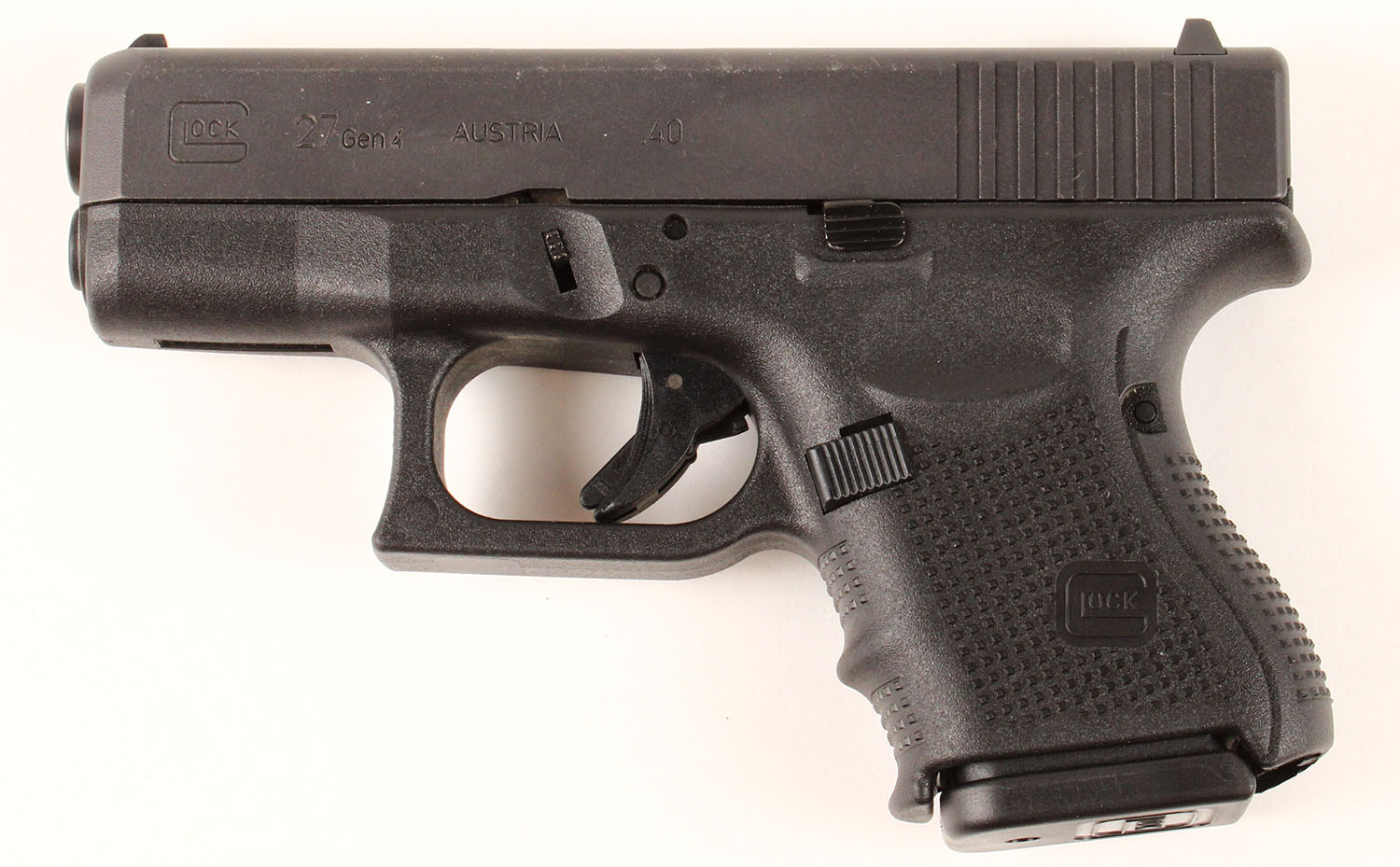 NEW CASED, Glock, Model 27 Gen 4, CAL: 40 S&W, MFG: Modern, SN: SFZ715, Semi Auto Pistol, 3 3/8'' barrel. The textured polymer grip & frame are mint. The factory matte black slide is mint. Bore is mint. Factory sights. Comes with factory test fire cartridge, safety pamphlet, lock/key, cleaning rod/brush, (3) 9rd mags & (2) 22rd mags. NOS. FFL Req. - Value: 450 to 650