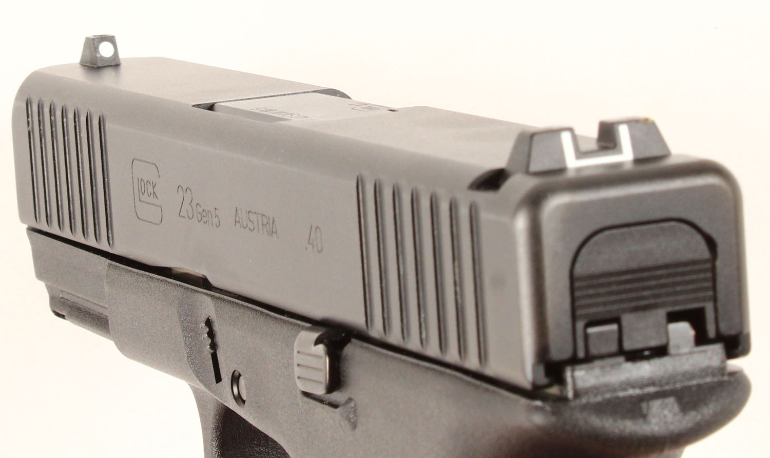 NEW CASED, Glock, Model 23 Gen 5, CAL: 40, MFG: Modern, Semi Auto Pistol, 3 1/2'' barrel. The textured polymer grip & frame are mint. The factory matte black finish is mint. Bore is mint. Factory square notch rear sight & single dot front sight. Comes in factory hard case, with owners manual, lock/key, cleaning rod/brush, grip attatchments, (3) 13rd mags & speed loader. NOS. FFL Req. - Value: 500 to 650