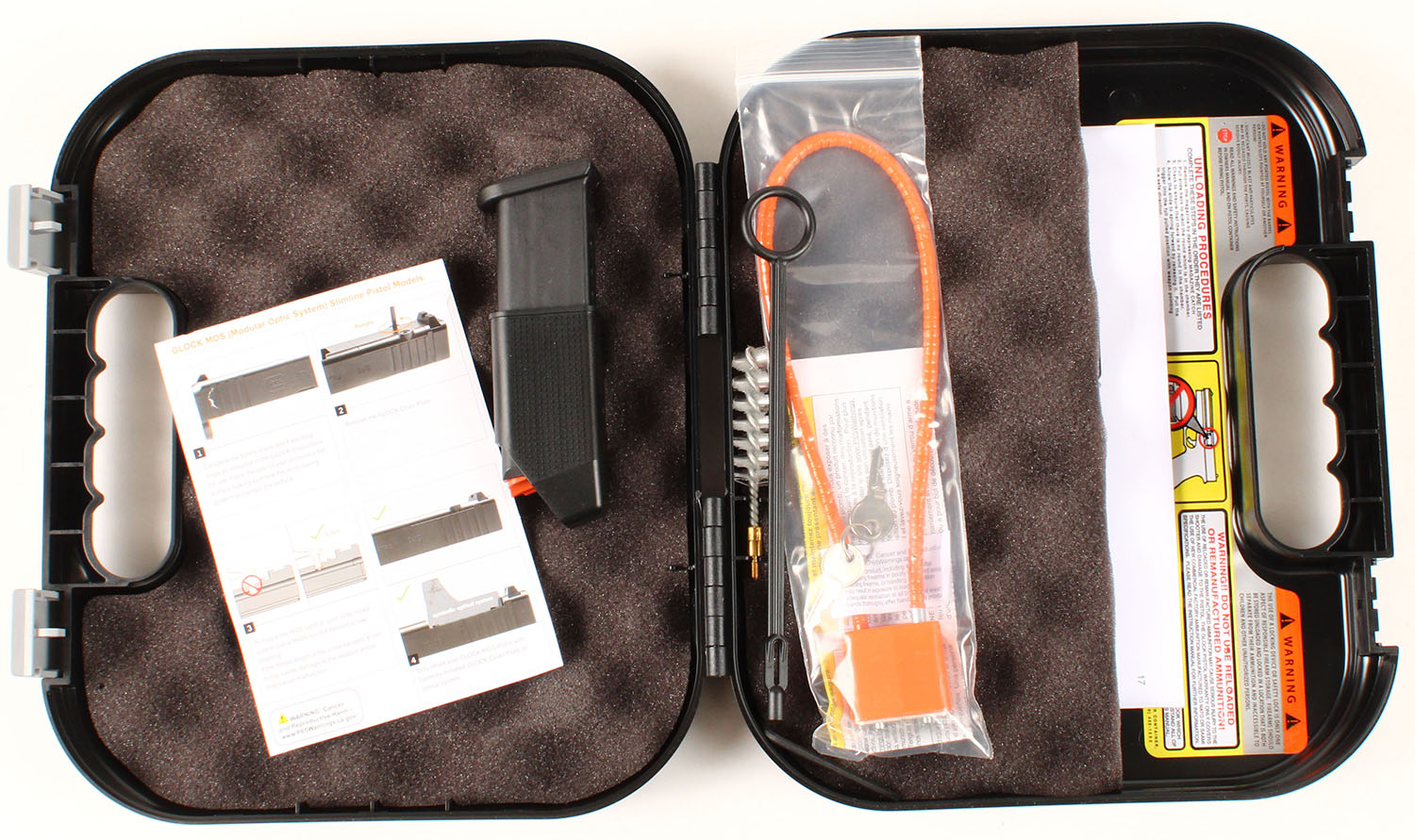 NEW CASED, Glock, Model 43X Gen 5 MOS, CAL: 9mm, MFG: Modern, Semi Auto Pistol, 3 1/2'' barrel. The textured polymer grip & frame are mint. The factory matte black finish is mint. Bore is mint. Factory square notch rear sight & single dot front sight. Comes in factory hard case, with owners manual, MOS sheet, lock/key, cleaning rod/brush, grip attatchments, (2) 15rd mags & speed loader. NOS. FFL Req. - Value: 450 to 550
