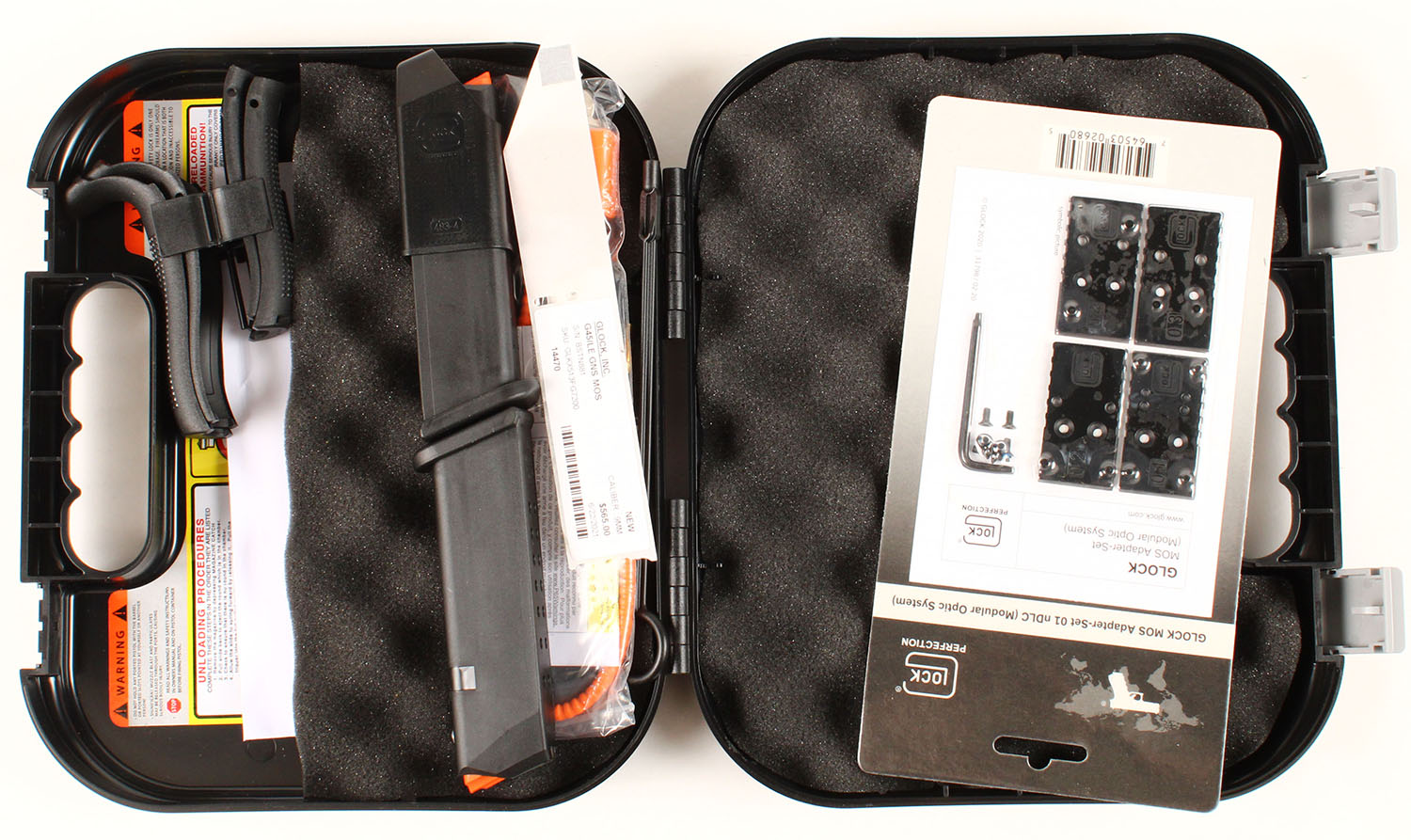 NEW CASED, Glock, Model 45 Gen 5 MOS, CAL: 9mm, MFG: Modern, Semi Auto Pistol, 4'' barrel. The textured polymer grip & frame are mint. The factory matte black finish is mint. Bore is mint. Factory rear two dot night sight & front dot night sight. Comes in factory hard case, with owners manual, lock/key, cleaning rod/brush, grip attatchments, Glock MOS Adapter Set 01, (3) 17rd mags & speed loader. NOS. FFL Req. - Value: 500 to 650