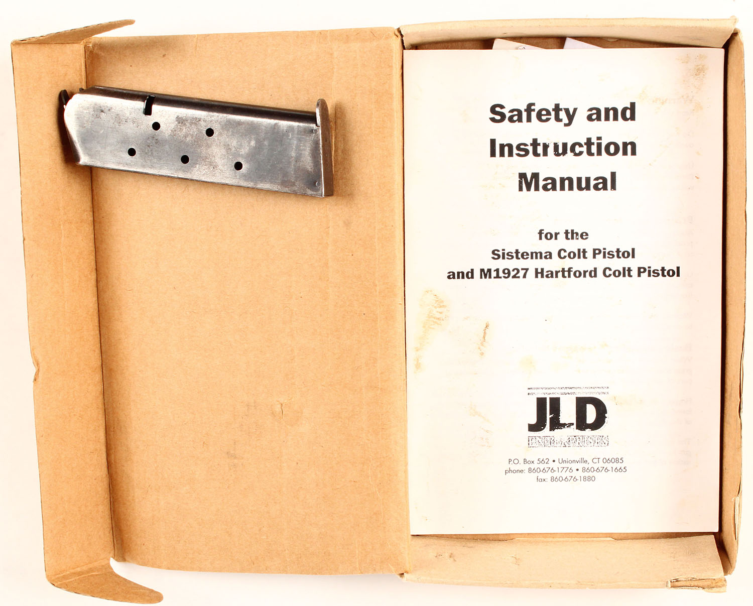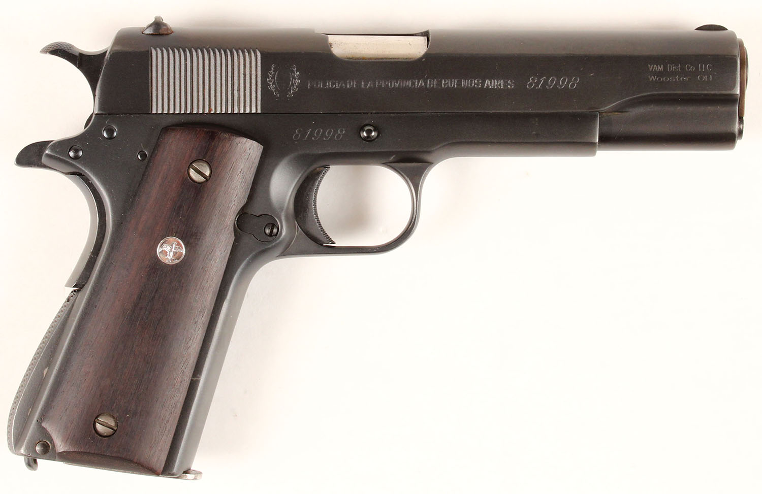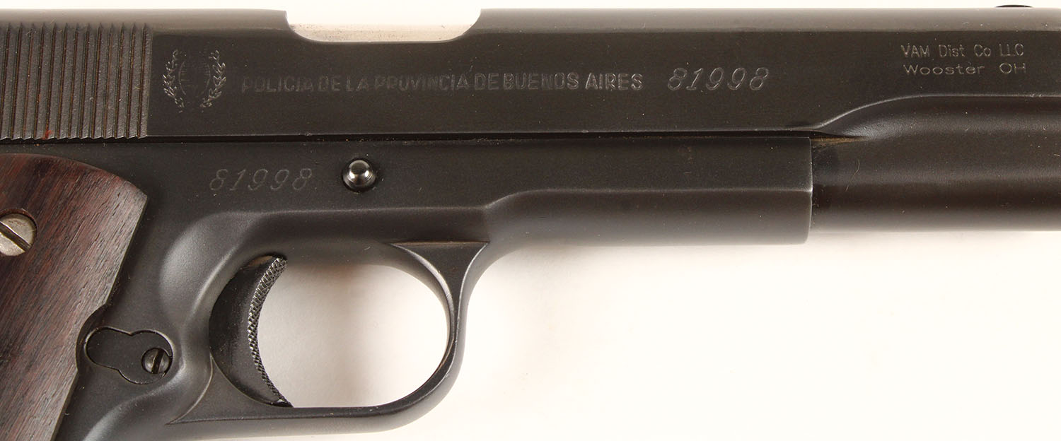 D.G.F.M - (F.M.A.P), Model 1927, CAL: 45ACP (11.25mm), MFG: 1954, SN: 81998, Semi-Auto Pistol, 5'' barrel. The left side of the slide is marked ''D.G.F.M - (F.M.A.P)'' & the right side of the frame is marked ''POLICIA DE LA PROVINCIA DE BUENOS AIRES''. The full SN is marked on the right side of the frame & twice on the slide. The silver bird logo medallion wood grips are excellent. The restored military style finish is excellent, rating 99%. Some of the stampings were buffed thin during the re-finish process. Bore is excellent, but appears grainy. Factory fixed notch & blade sights. Bottom of mag is stamped ''5615''. Comes in plain cardboard box. Box is aged. These pistols are generally considered to be of good quality. This example appears to be a solid .45 automatic that should make a perfectly fine shooter. FFL or C&R Req. - Value: 500 to 1000