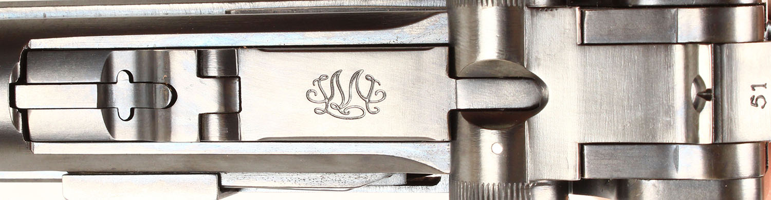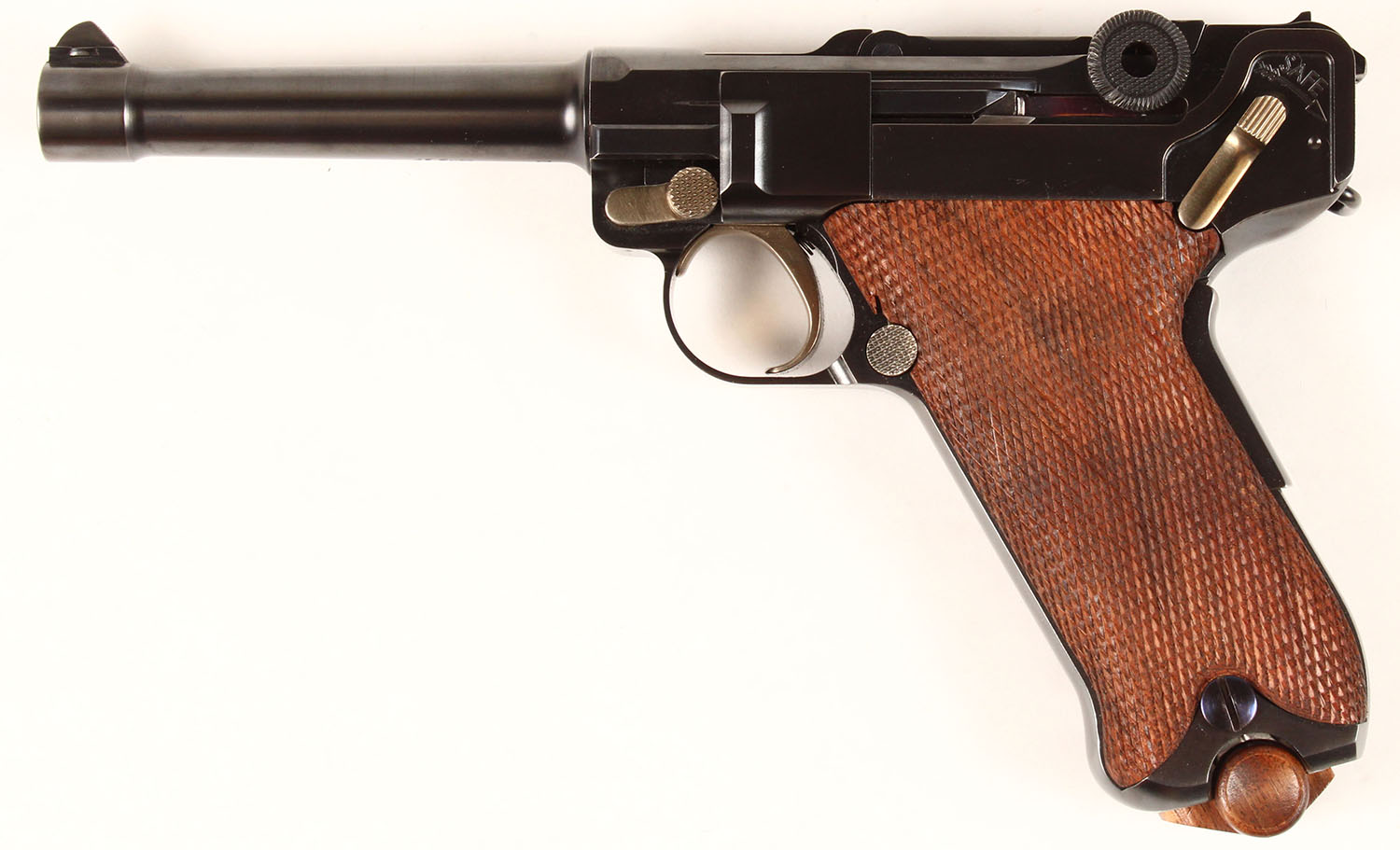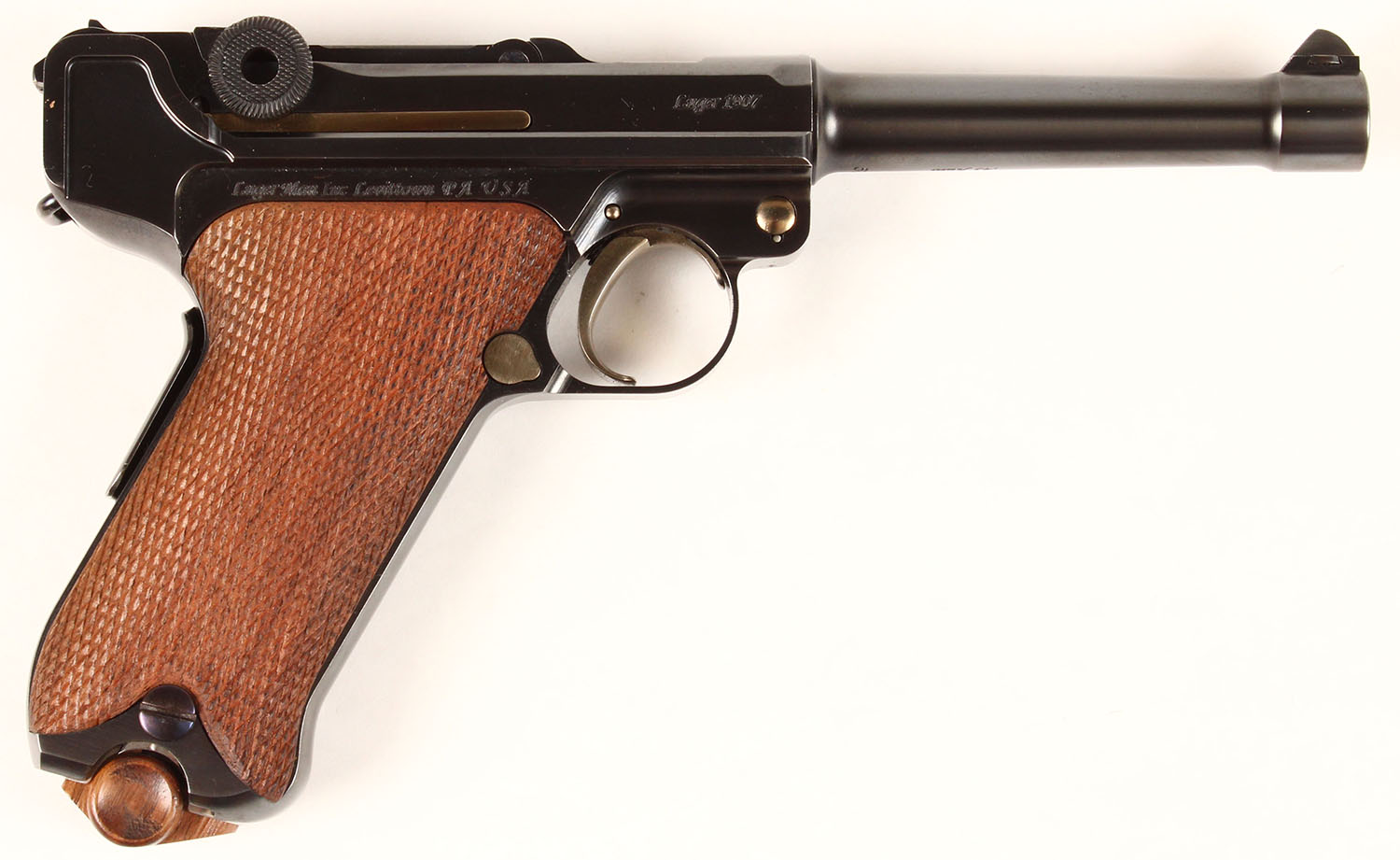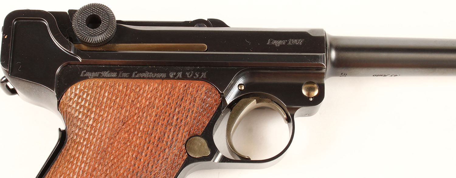 CASED, LugerMan Inc, Luger 1907 Classic, CAL: 45 AUTO, MFG: Modern, SN: 51, Semi Auto Pistol, 4 3/4'' barrel. The top of the slide is marked ''LMI'' in a similar fashion to the original ''DWM'' logo. The SN (51) can be found on the bottom of the barrel, front of the frame, back of the frame & on the bottom of the side plate. The bottom of the barrel is stamped ''45 AUTO'' & the right side of the frame is marked ''LUGER MAN INC LEVITTOWN PA USA''. The original hand checkered walnut grips are excellent & minty. The hand finished metal blue rates 99%+ overall. Gold tone trigger, safety & take down lever. The rear toggle link has a fixed notch rear sight & the barrel holds a blade front sight. Comes in a beautiful wood presentation case, with clear screw-in top. In the case is loading tool & two extra mags. A very high quality reproduction Luger. This pistol retails on LugerMan.com for $8395. FFL Req. - Value: 6000 to 9000