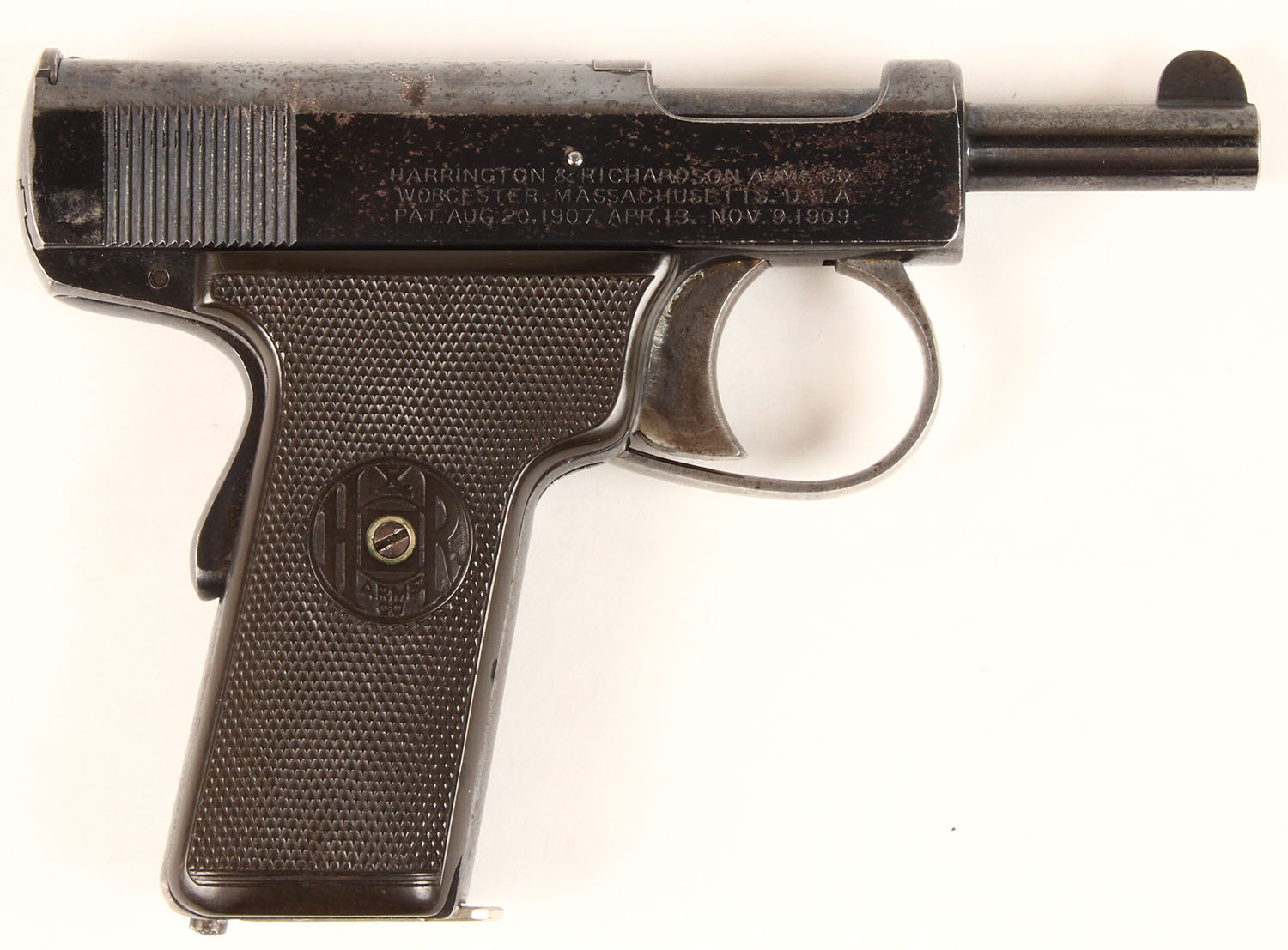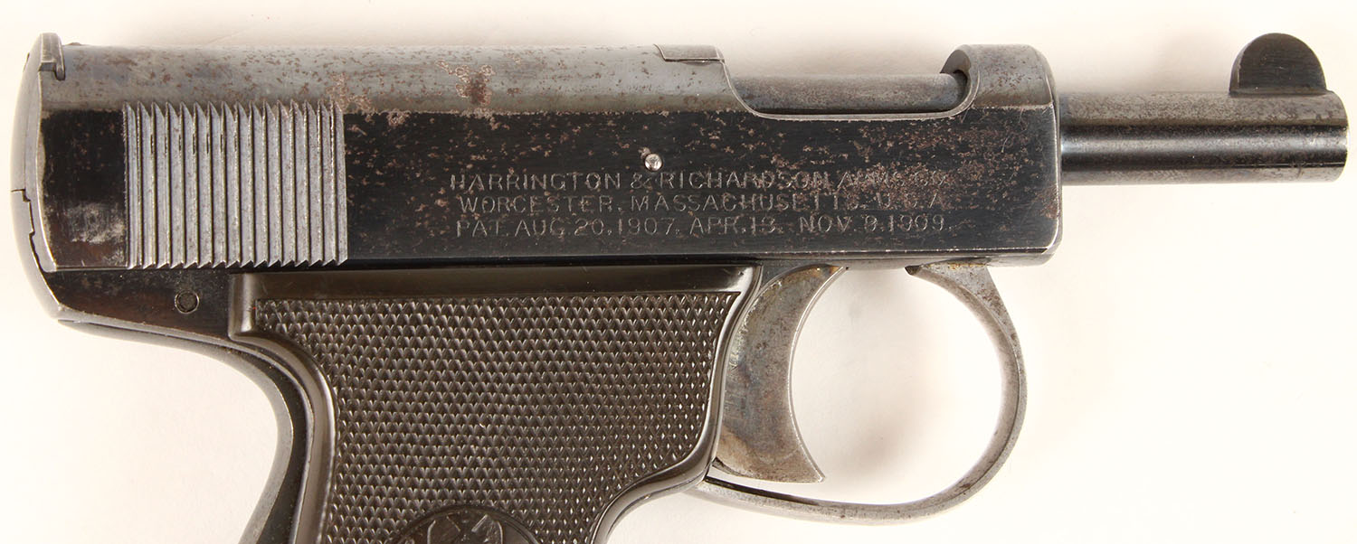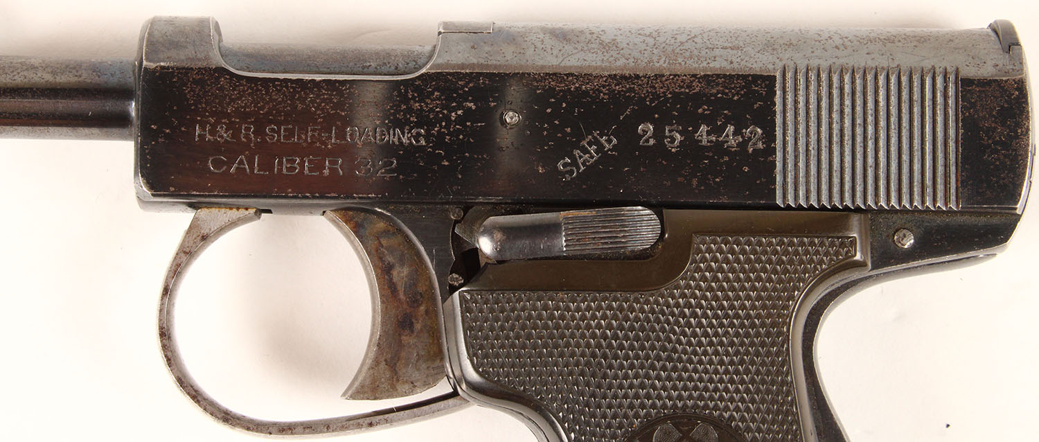Harrington & Richardson, Model ''Self-Loading'', 3rd Issue, CAL: 32, MFG: 1914-24, SN: 25442, Semi-Auto Pistol, 3 1/2'' barrel. The H&R marked, checkered brown hard rubber grips are excellent, with minor handling marks & one small chip at the upper corner of the left grip near the safety lever. The metal blue finish rates 80%, with consistent spotting throughout & areas worn to metal grey. Stampings are clear. Bore is very good, slightly rough, displaying normal wear from honest use. The slide holds a notch rear sight & the barrel holds a tall halfmoon blade front sight. FFL or C&R Req. - Value: 500 to 900
