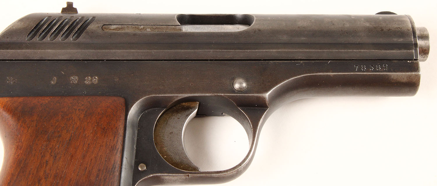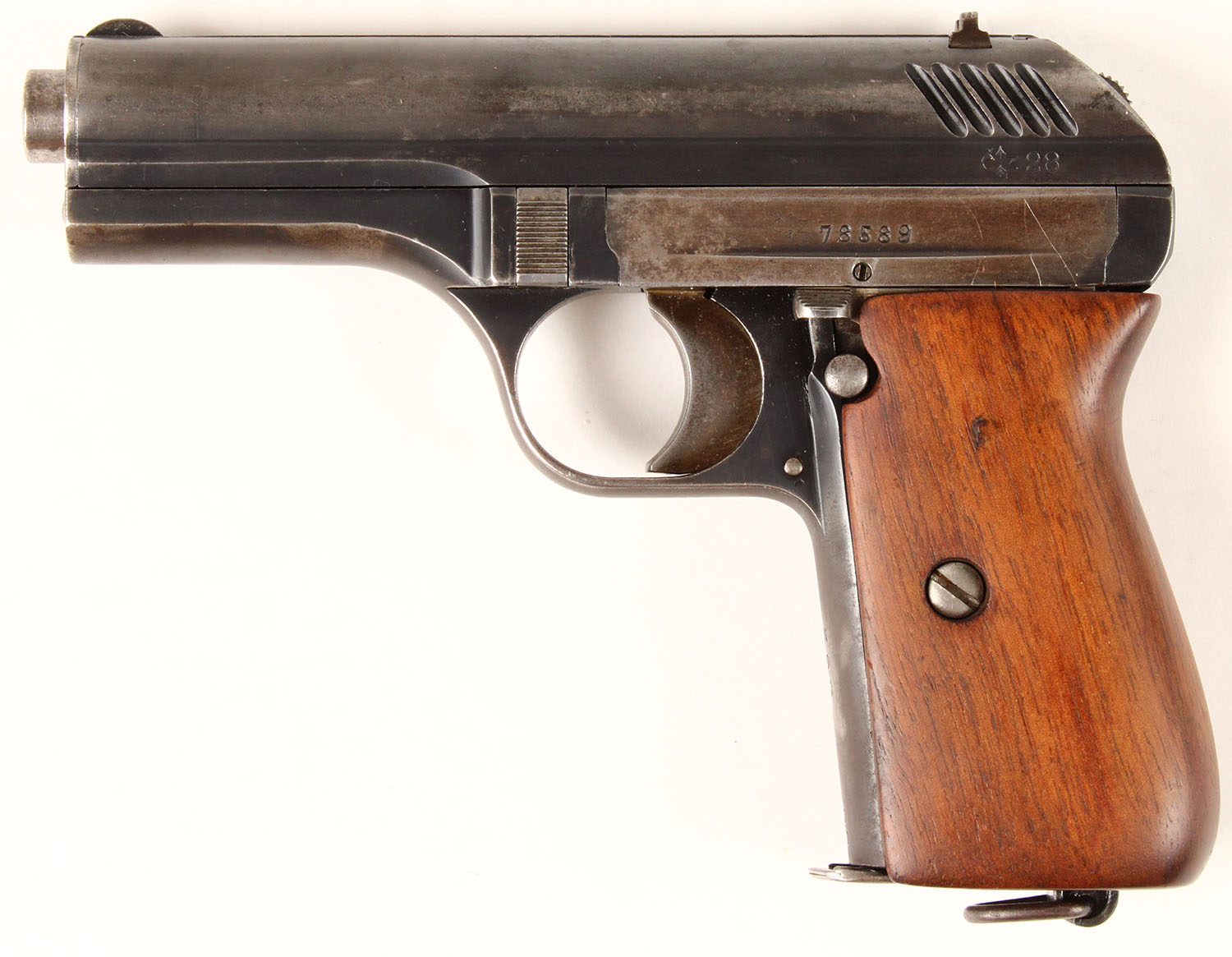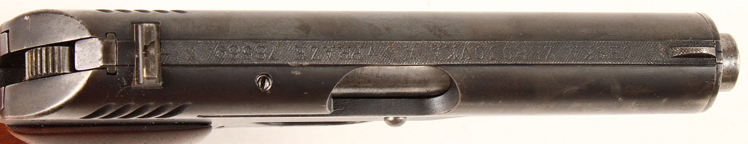 CZ, Model CZ-24, CAL: 380, MFG: 1928, SN: 78589, Semi-Auto Pistol, 3 1/2'' barrel. The original wood grips are excellent & solid, having been refinished. The metal blue finish rates 70% overall, with areas worn to metal grey & intermittent speckling. Stamping are crisp. Bore is very good, with light spotting throughout. The slide holds notch & blade sights. Lanyard loop. Spring loaded click button safety. FFL or C&R Req. - Value: 400 to 800