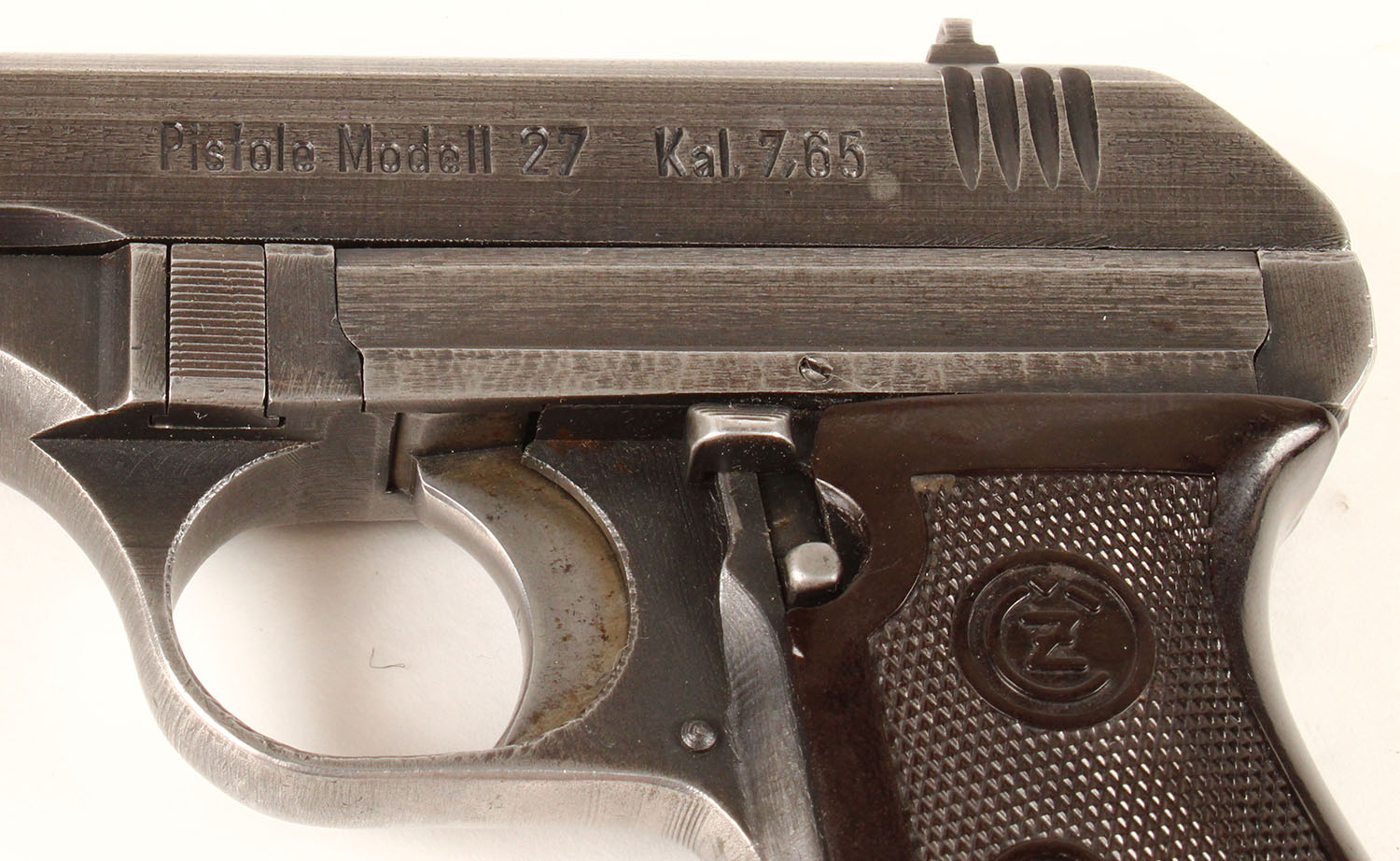 Bohmische Waffenfabrik, Model: VZ 27 (P.27), Cal: 7.65 (32 ACP), MFG: 1939-45, S/N: 244577, semi auto pistol, 4'' barrel. The plastic checkered grips are good with chunk missing at the top of right grip, & scratches & wear from use/age. The metal finish rates 65% overall with finish remaining in most areas just thinned & worn. Left side of slide is marked ''Pistole Modell 27'' ''Kal. 7,65'', top op slide is marked ''BOHMISCHE WAFFENFABRIK A. G.IN PRAG'' & S/N, right side of frame is marked with a Waffenamt proof mark. Bore is excellent, bright & mirror like with no roughness. Blade front sight, V-notch rear sight. Comes with aftermarket holster & spare mag. FFL or C&R Req - Value: 400 to 800