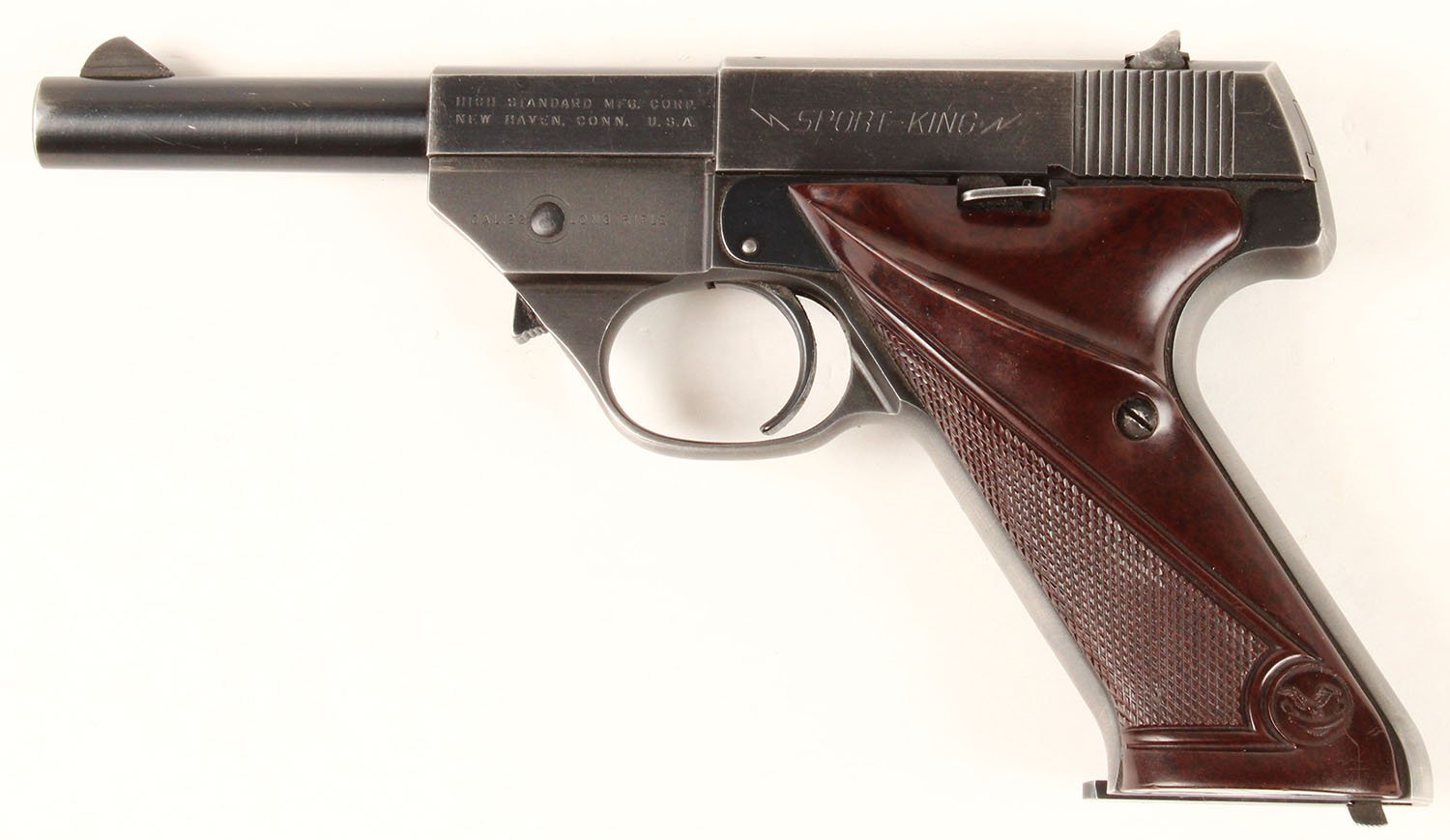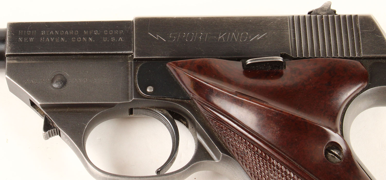 High Standard, Model ''Sport King'', CAL: 22LR, MFG: 1951, SN: 340587, Semi Auto Pistol, 4 1/2'' barrel. The HS checkered target grips are excellent, with minor dings & handling marks. The metal blue finish rates 90%, with light overall wear. Bore is excellent, with visible light wear fro honest use. The slide holds a notch rear sight & the barrel has a serrated blade front sight. Comes with a interchangeable 6 1/4'' barrel, extra mag, & a S&W leather holster. FFL or C&R Req. - Value: 250 to 450