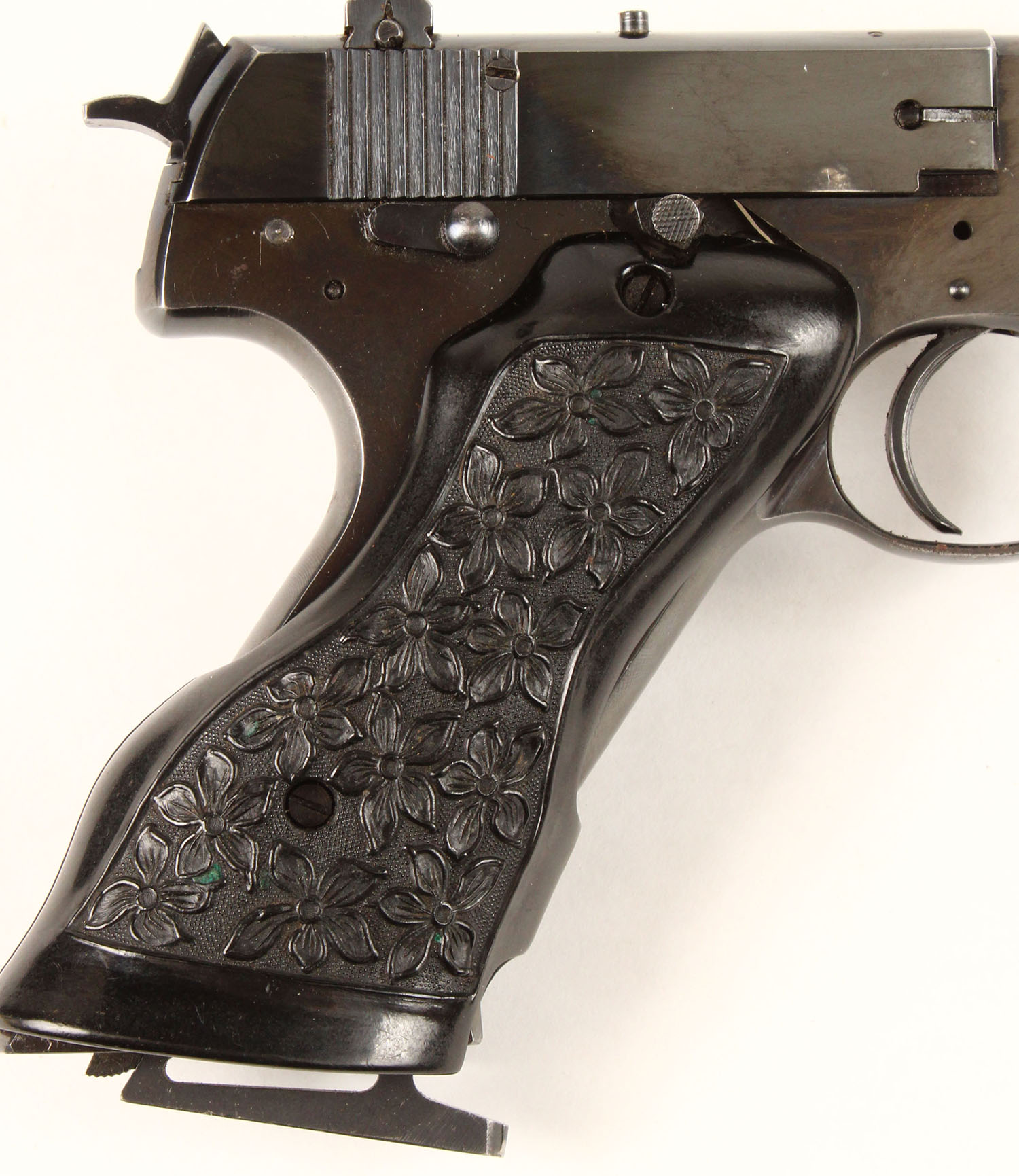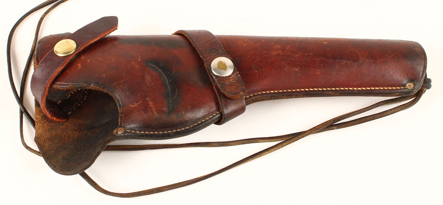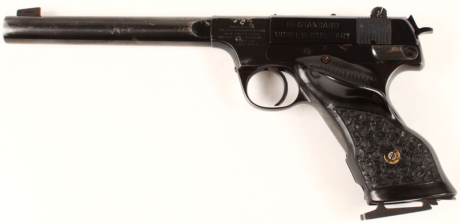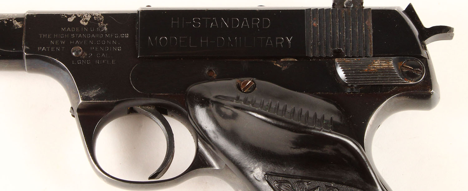 Hi-Standard, Model H-D Military, CAL: 22LR, MFG: 1947, SN: 174763, Semi Auto Pistol, 6 3/4'' barrel. The floral pattern & thumb rest plastic grips are excellent, with minor handling wear. The metal blue finish rates 95% overall, with light spotting, worn to metal grey. Bore is excellent. The slide holds an adjustable rear sight & the barrel has a serrated blade front sight. Comes with a leather holster that has ''BILLY FAYLE'' etched into it. FFL or C&R Req. - Value: 200 to 400