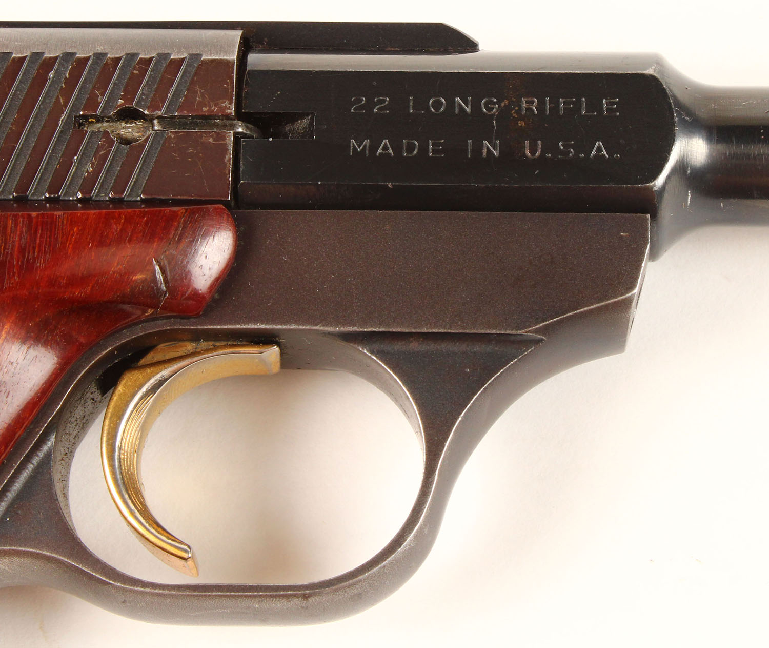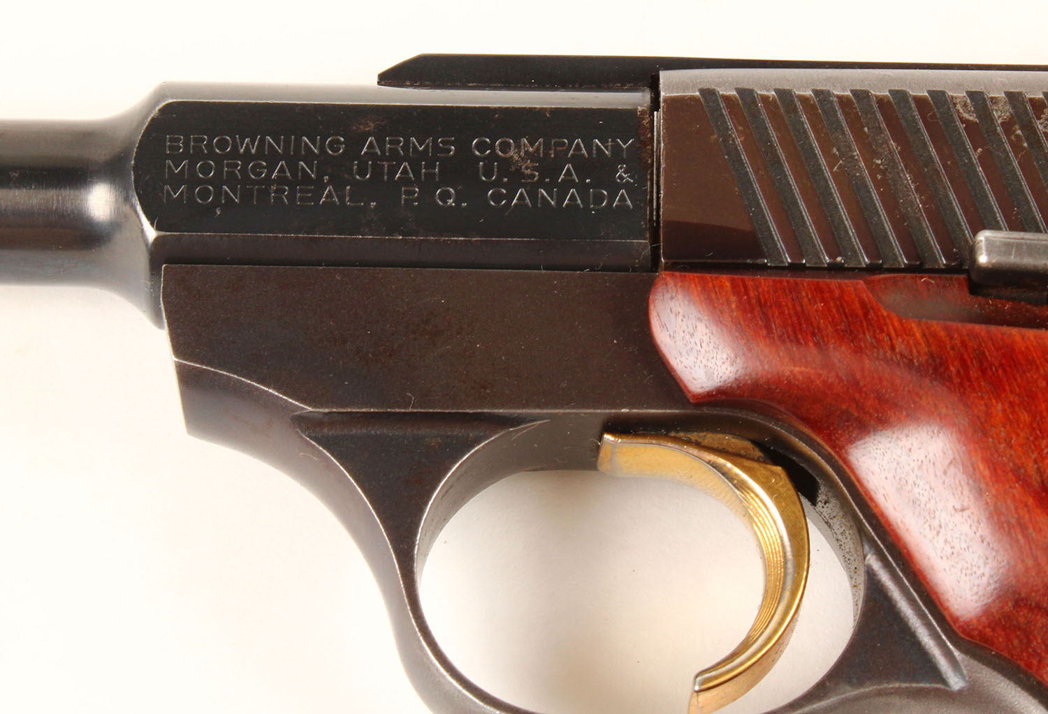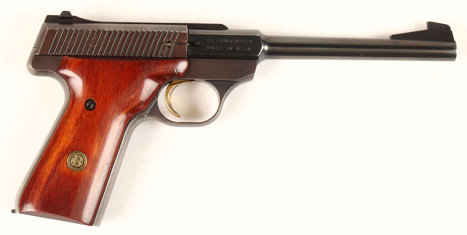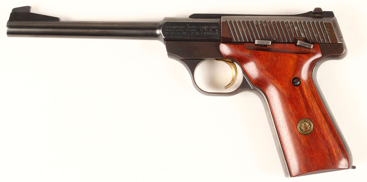 Browning, Challenger II, CAL: 22LR, MFG: 1977, SN: 655RR09832, Semi Auto Pistol, 6 3/4'' barrel. The early Browning brass medallion wood grips are excellent, with handling marks. The metal blue finish rates 97%, with some light intermittent spotting. The slide is toned plum. Gold tone trigger. Bore is excellent. The slide carries an elevated rear sight & the barrel has a serrated ramp elevated blade front sight. Comes with a Braver Bros leather holster. An early production Challenger II. FFL or C&R Req. - Value: 300 to 600
