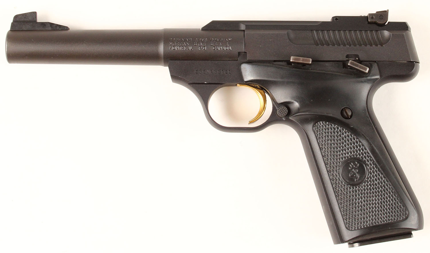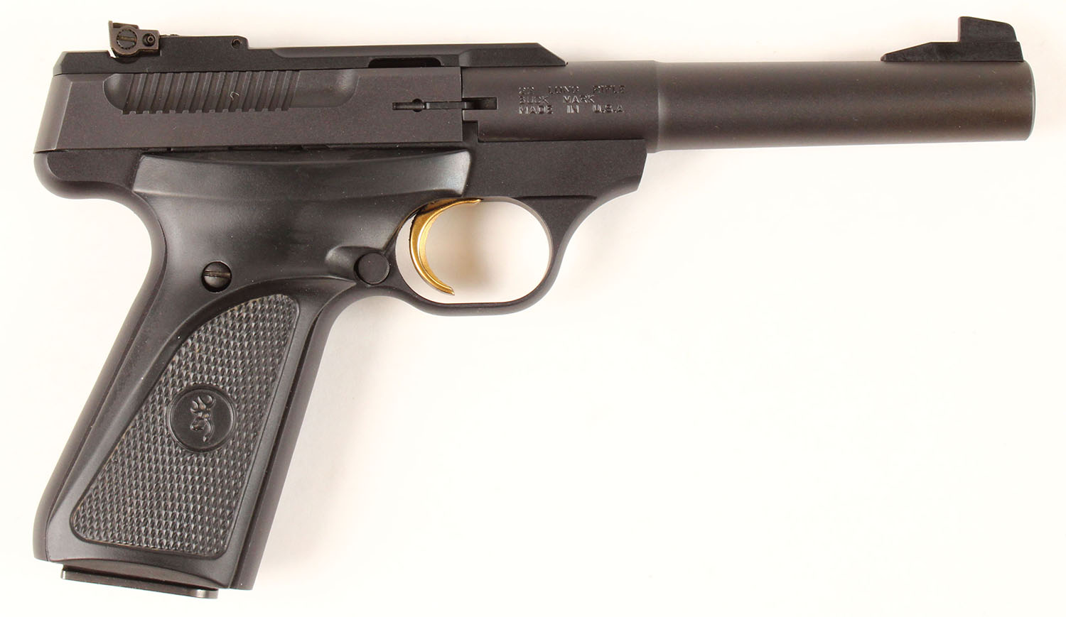 CASED, Browning, Buck Mark, CAL: 22LR, MFG: Modern, SN: 515MP16781, Semi Auto Pistol, 5 1/2'' barrel. The Browning logo checkered hard rubber grips are excellent. The matte black finish rates 99% overall. Bore is excellent. The top rib holds an adjustable rear sight & the barrel has a elevated blade front sight. Comes in original hard case, with owners manual, two extra mags, speed loader & snap caps. FFL Req. - Value: 300 to 600