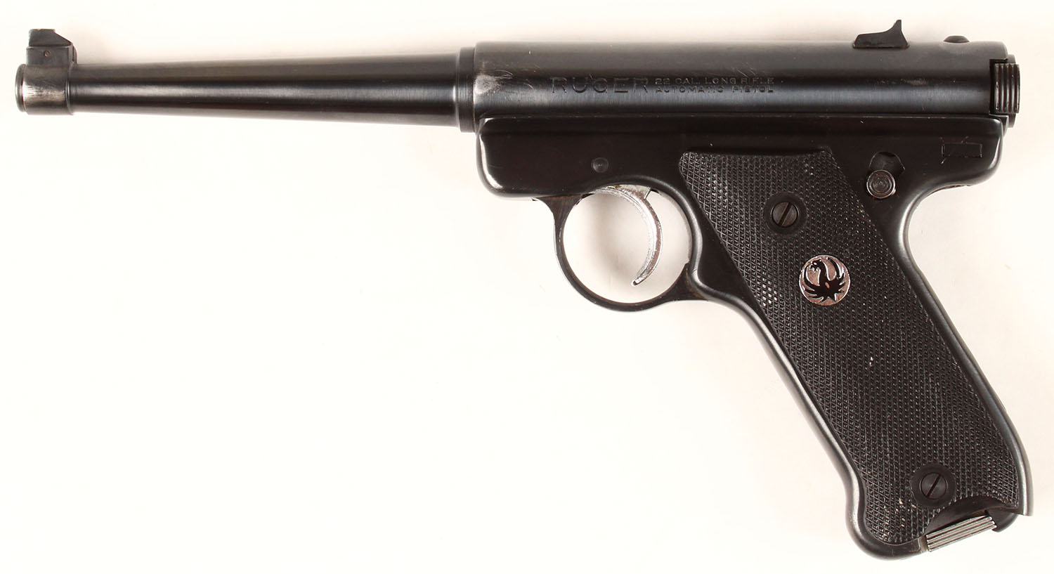 Ruger, Standard Model, CAL: 22LR, MFG: 1964, SN: 255910, Semi Auto Pistol, 6'' barrel. The Ruger logo checkered plastic grips are excellent, with minor scuffs & handling marks. The metal blue finish rates 95% overall. Bore is excellent & bright. The frame holds a notch rear sight & elevated blade front sight. FFL or C&R Req. - Value: 250 to 500