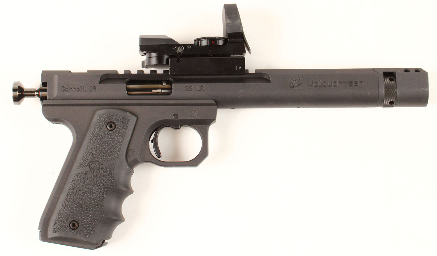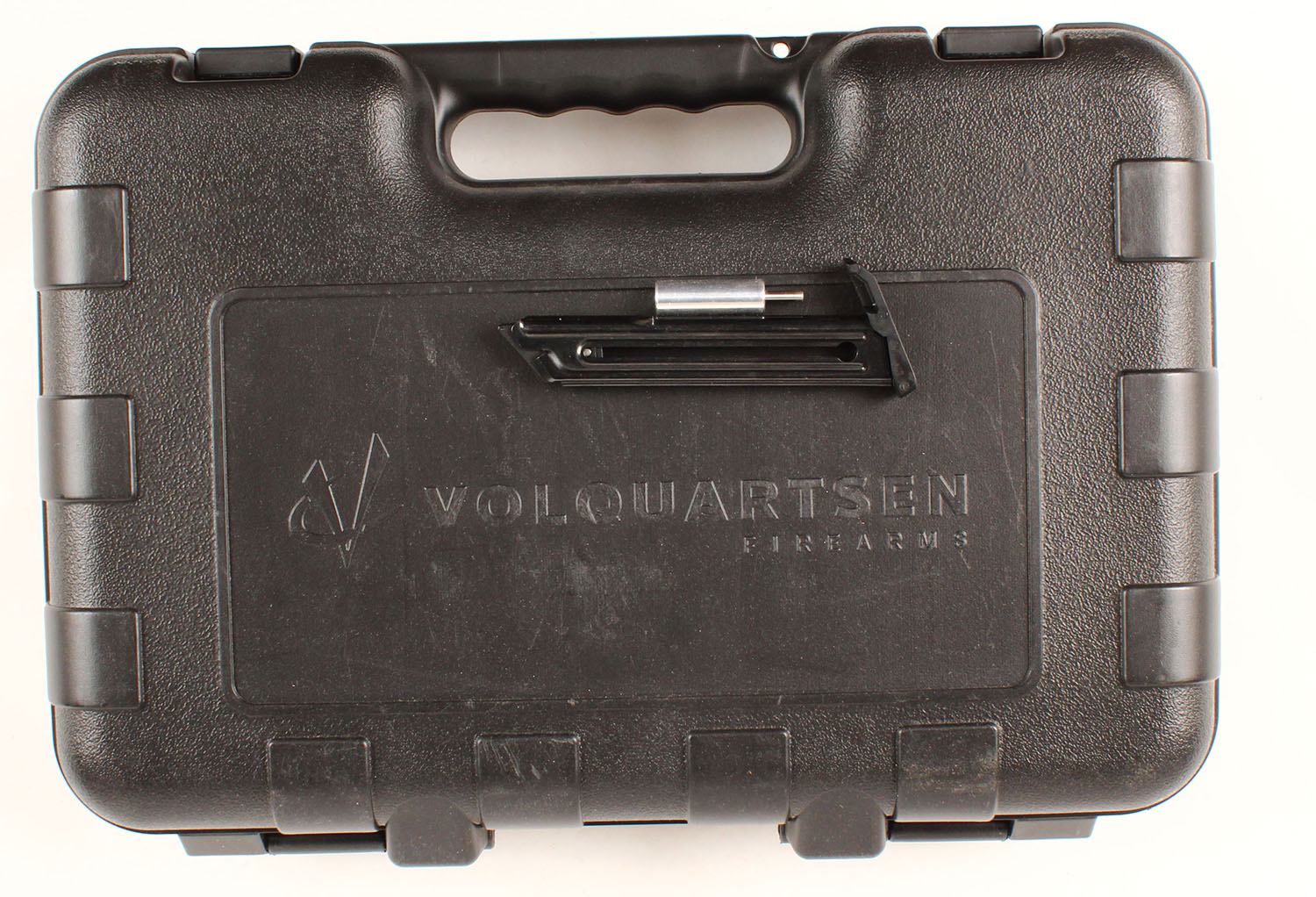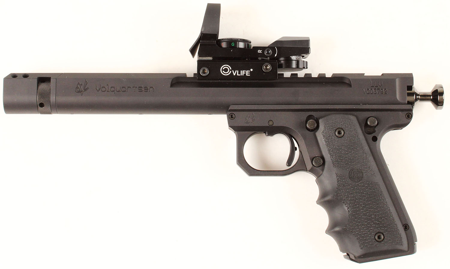 CASED, Volquartsen, Scorpion, 1911 Style Frame, CAL: 22LR, MFG: Modern, SN: VC03792, Semi Auto Pistol, 7 5/8'' barrel. Volquartsen has combined their LLV competition upper with their lightweight VF Target Frame to create a very lightweight & extremely accurate pistol. The upgraded beaded Hogue grips are excellent. The matte black finish rates 99%+overall. Bore is excellent & bright, with sharp rifling. The LLV upper holds a VLIFE Holographic sight, it has both green & red color options, with (4) different reticles to choose from. There is an open rear dovetail for target rear sights & two filled screw holes for a rail fiber optic front sight. Comes in factory Volquartsen hard case, with (2) Ruger mags & disassembly tool for the LLV upper. An extremely high quality target pistol, ready for the range! FFL Req. - Value: 1400 to 2200