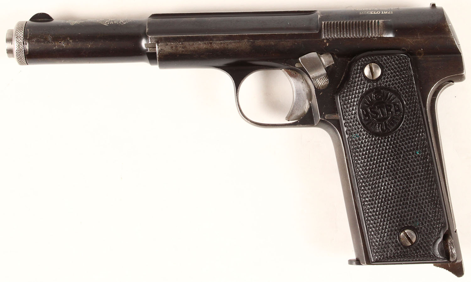 Astra, Model 1921 (400), CAL: 9mm, MFG. 1921-50, SN: 13472, Semi Auto Pistol, 6'' barrel. This pistol was the standard issue sidearm in the Spanish Army during the Spanish Civil War & also saw service in Germany during World War II. Designed to be safe to fire with a simple blowback action unaided by any breech-locking devices. The pistol also featured an internal hammer & left sided combined slide lock/safety behind the trigger guard. The Astra marked checkered plastic grips are excellent, with handling wear. The metal blue finish is a mix of original & applied blue rating 85% overall, with small areas of cleaned pitting on the left side of the pistol. Stampings are clear. Bore is very good, but consistently rough throughout. Fixed notch & blade sights. Astra stamped 8 round detachable mag. Lanyard staple. FFL or C&R Req. - Value: 200 to 400