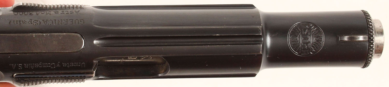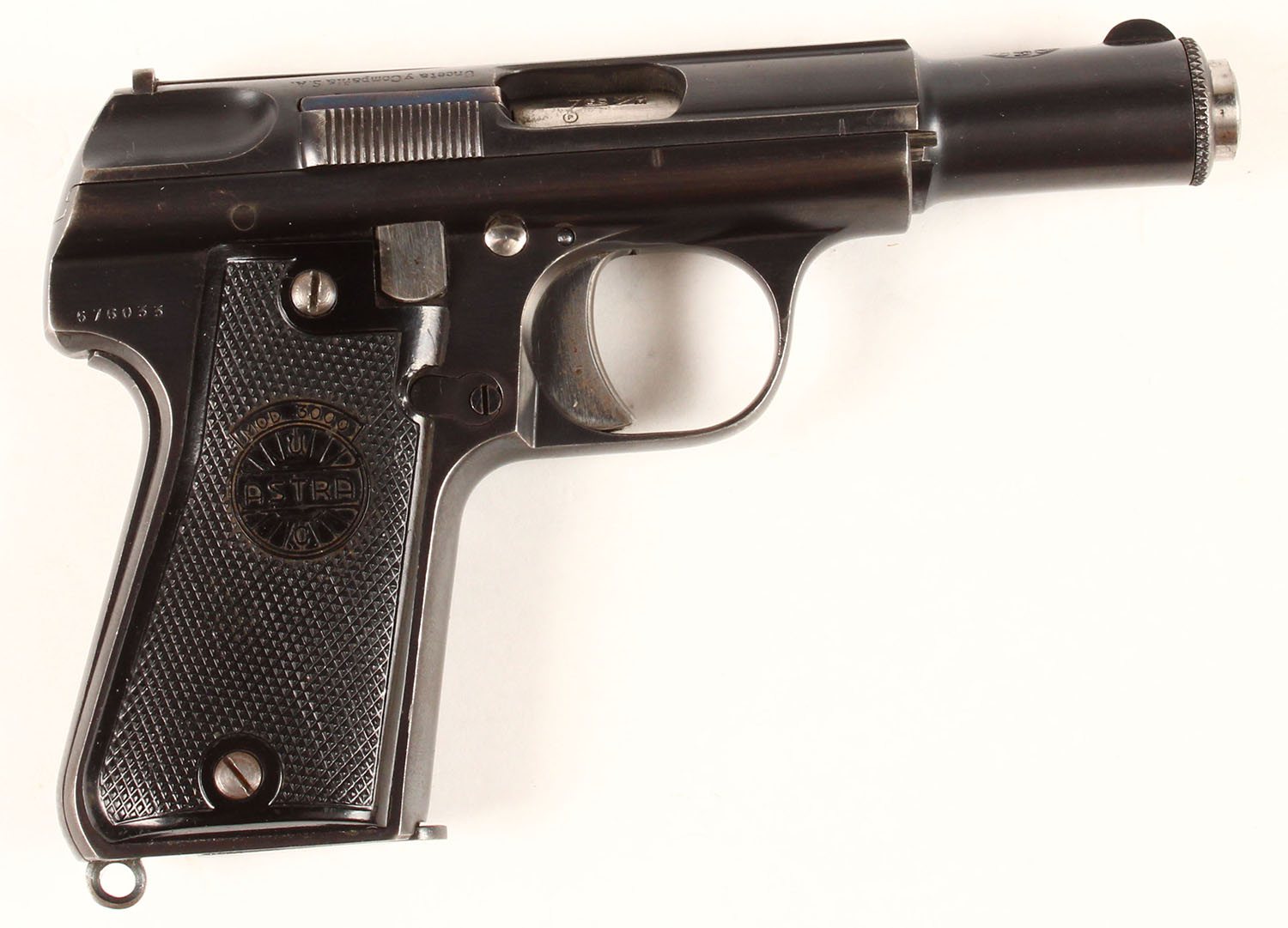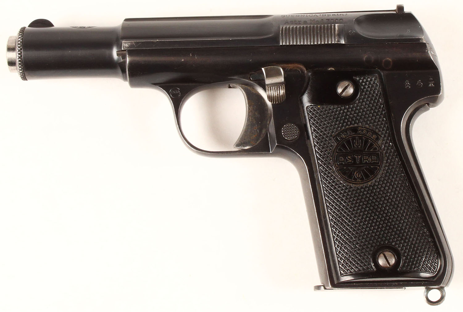 Astra, Model 3000, CAL: 7.65, MFG: 1948-56, SN: 676033, Semi Auto Pistol, 3 7/8'' barrel. The Astra logo checkered plastic grips are excellent, with handling wear. The metal blue finish rates 97% overall. Bore is excellent. The slide holds notch & blade sights. The Astra 3000 is a more up-to-date version of the Astra 300. The few changes included a chamber-loaded indicator at the rear of the slide & the magazine catch was originally on the heel of the butt, but in 1953 was moved to the frame, indicating this example was a later production. FFL or C&R Req. - Value: 300 to 600