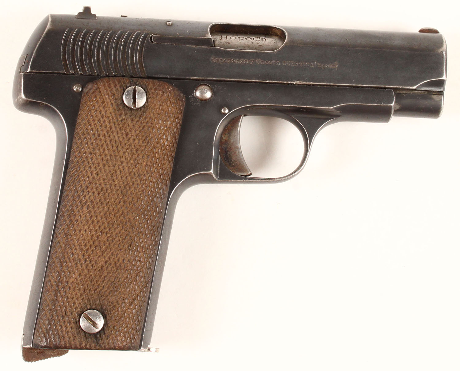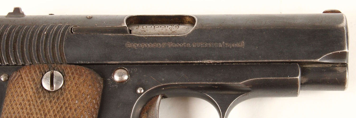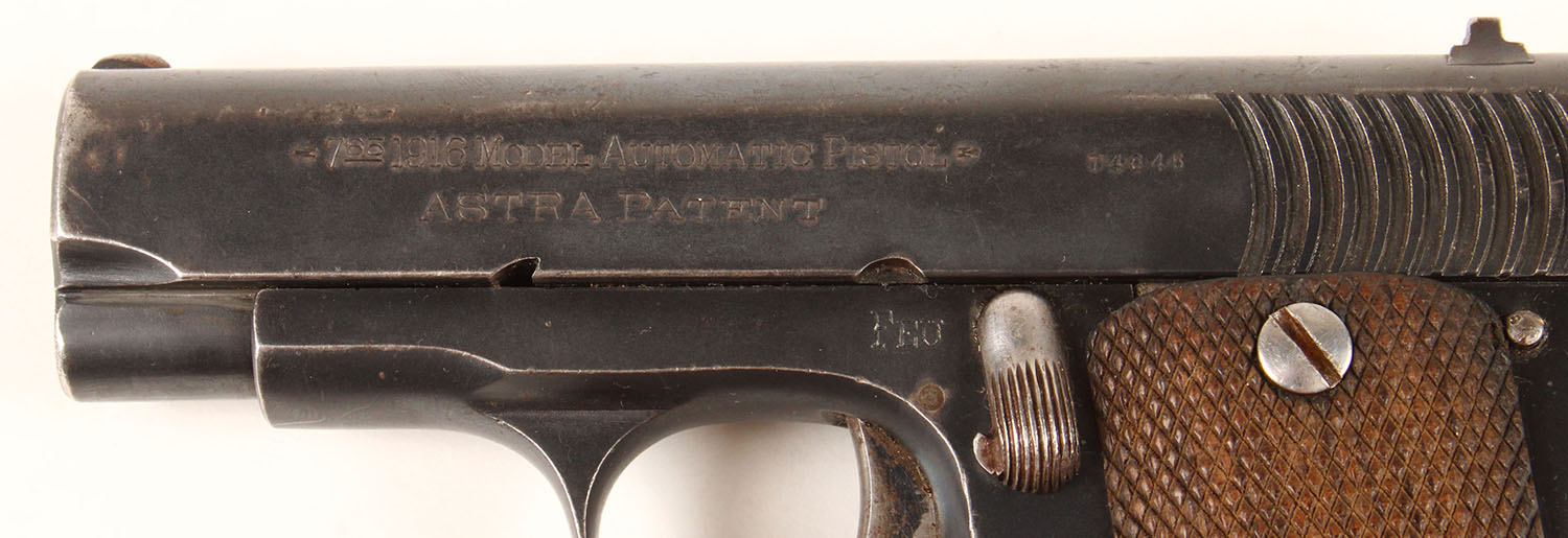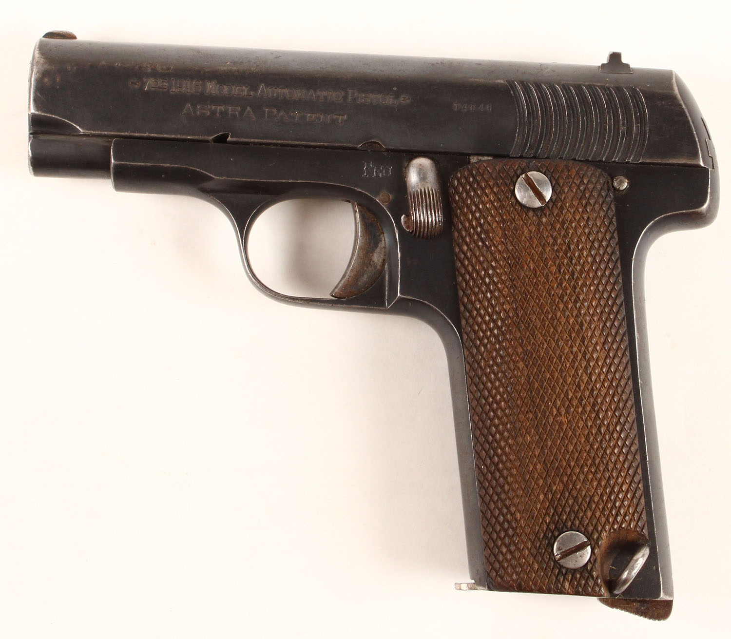 Astra, Model 1916 Automatic Pistol, CAL: 7.65, MFG: 1920's. SN: 74846, Semi Auto Pistol, 3 1/2'' barrel. The checkered wood grips are excellent. The metal blue finish rates 85% overall, with areas worn to metal grey & toned to a brown patina.The slide is marked ''HOPE'' ''Crown /PG''. The right side of the frame is marked ''FEU'' & the bottom of the mag is marked ''EU'' in a circle. Bore is excellent. The slide carries notch & blade sights. Lanyard loop. FFL or C&R Req. - Value: 200 to 400