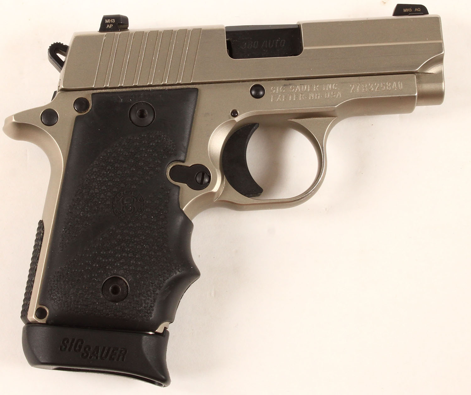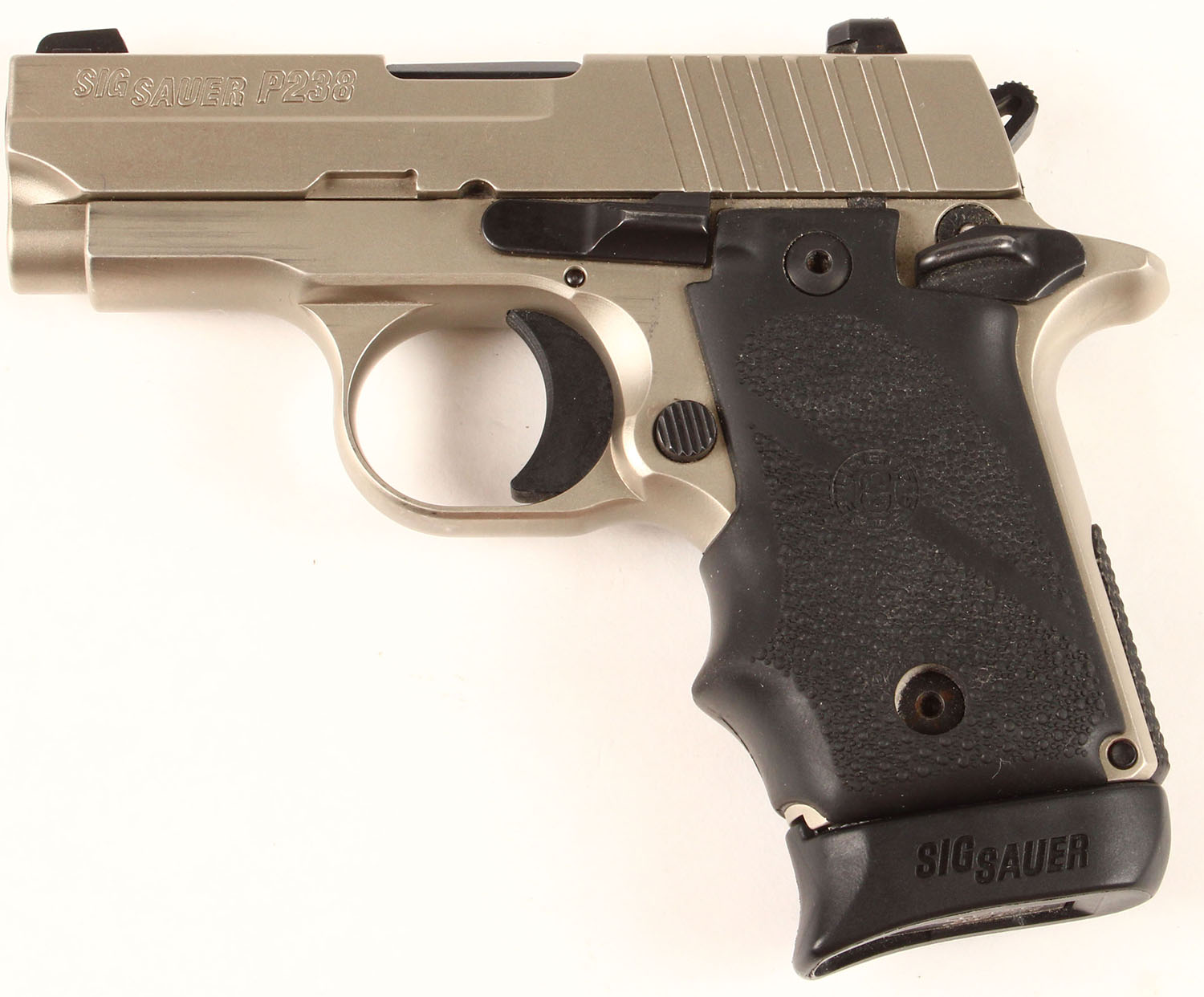 CASED, Sig Sauer, Model P238, CAL: 380 AUTO, MFG: Modern, SN: 27B325840, Semi Auto Pistol, 2 3/4'' barrel. The upgraded Hogue textured rubber grips are excellent. The stainless steel finish on the frame & slide is excellent. Bore is excellent. The slide holds a dual dot night rear sight & single night dot front sight. Comes in factory hard case, with paperwork, original grips, lock, holster & extra mag. FFL Req. - Value: 600 to 900