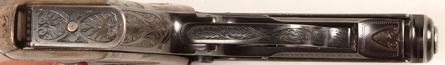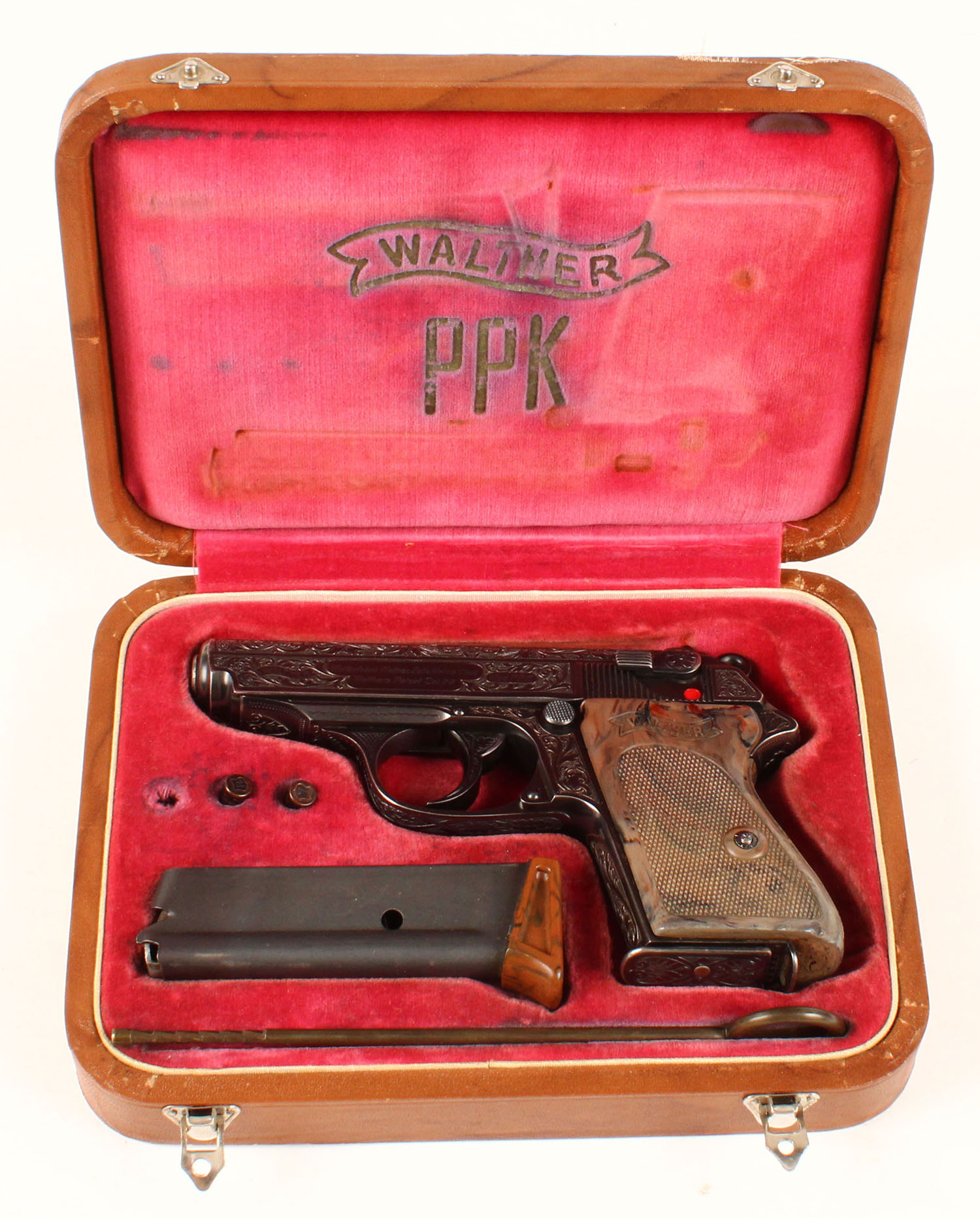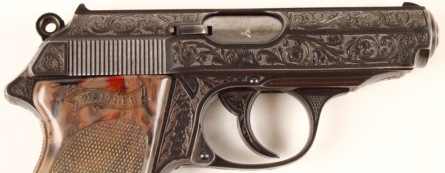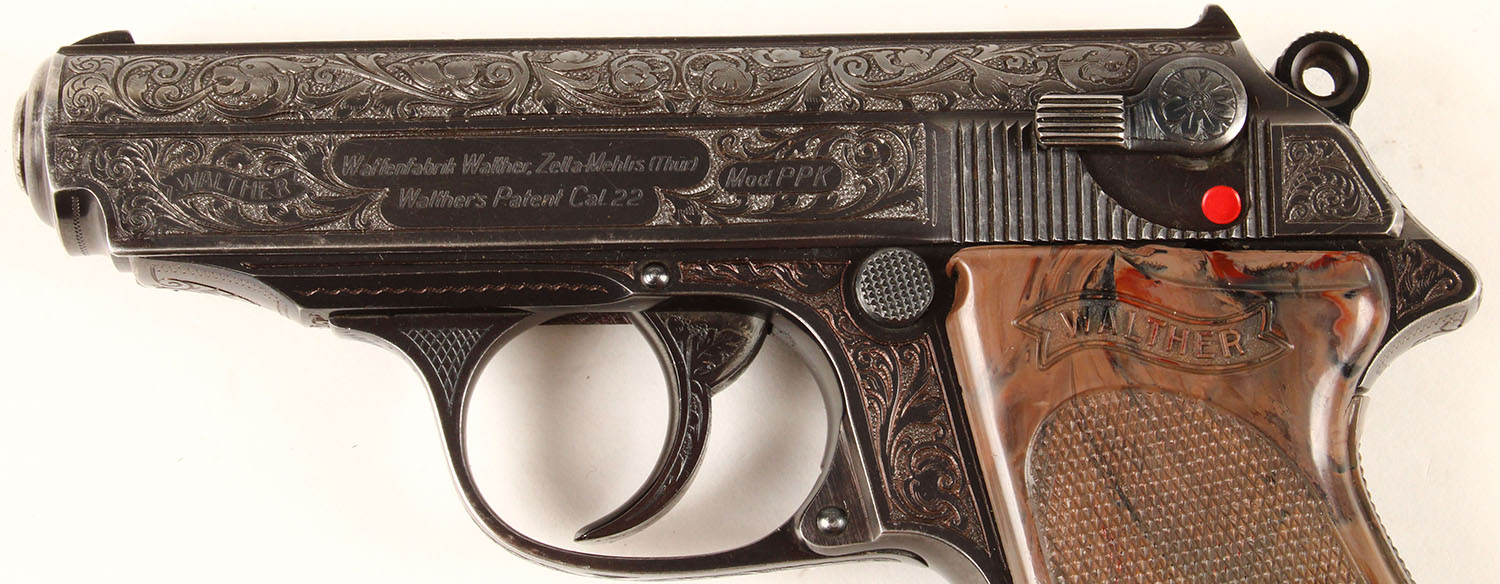 RARE CASED & ENGRAVED Walther Model PPK Presentation Pistol, CAL: .22, MFG: 1935, SN: 856183, Semi Auto Pistol, 3 1/4'' barrel. Fantastic factory engraved Pre WWII PPK. PPK stands for Polizei Pistole Kriminal. These pistols were adopted by the Luftwaffe & German Staff Officers. These are sometimes referred to as ''Presentation'' pistols as they were often presented to high level officers within the Nazi Military & other dignitaries or people of influence. This example has nearly full coverage lavish & deep floral scroll & border engraving, including on slide, frame, trigger guard, trigger, safety lever & on bottom plate of the mag. The left side of the slide is marked ''WALTHER'', ''Waffenbrik Walther, Zella-Mehlis (Thur)'', ''Walther's Patent Cal .22'', ''Mod PPK''. Right side of frame carries SN. The Walther checkered brown plastic grips are excellent, although there is a couple of tiny hairline stress cracks at the top of the backstrap & one at the bottom by the mag slot. The original metal blue finish rates 97% overall. Bore is excellent. The matted top of slide holds factory fixed sights. Come in the original factory presentation case, with second magazine, a cleaning rod & two rounds of ammunition. Case is very good to excellent. FFL or C&R Req. - Value: 7000 to 12000