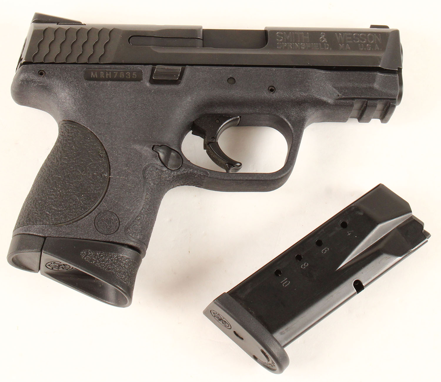 Smith & Wesson, Model M&P 40c, CAL: 40 S&W, MFG: Modern, SN: MRH7835, Semi Auto Pistol, 3 1/2'' barrel. The S&W logo textured polymer grip & frame is excellent. The matte black Armornite finish on the slide is excellent. Bore is excellent. The slide holds a white 2 dot rear sight & white dot front sight. Comes with an extra mag. A good compact pistol in a caliber with some stopping power. FFL Req. - Value: 300 to 600