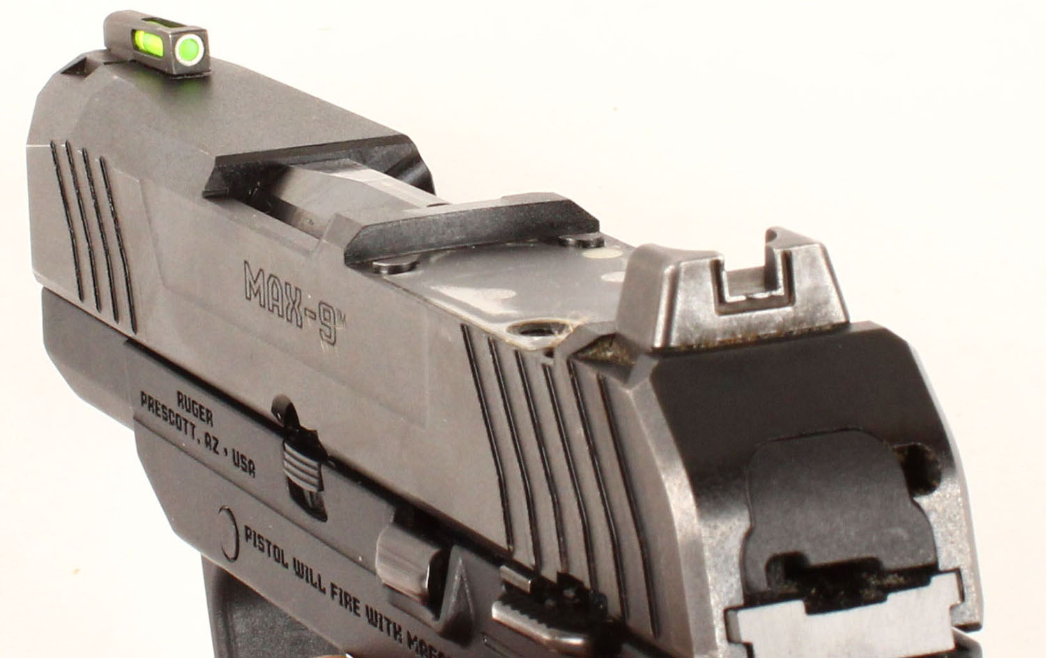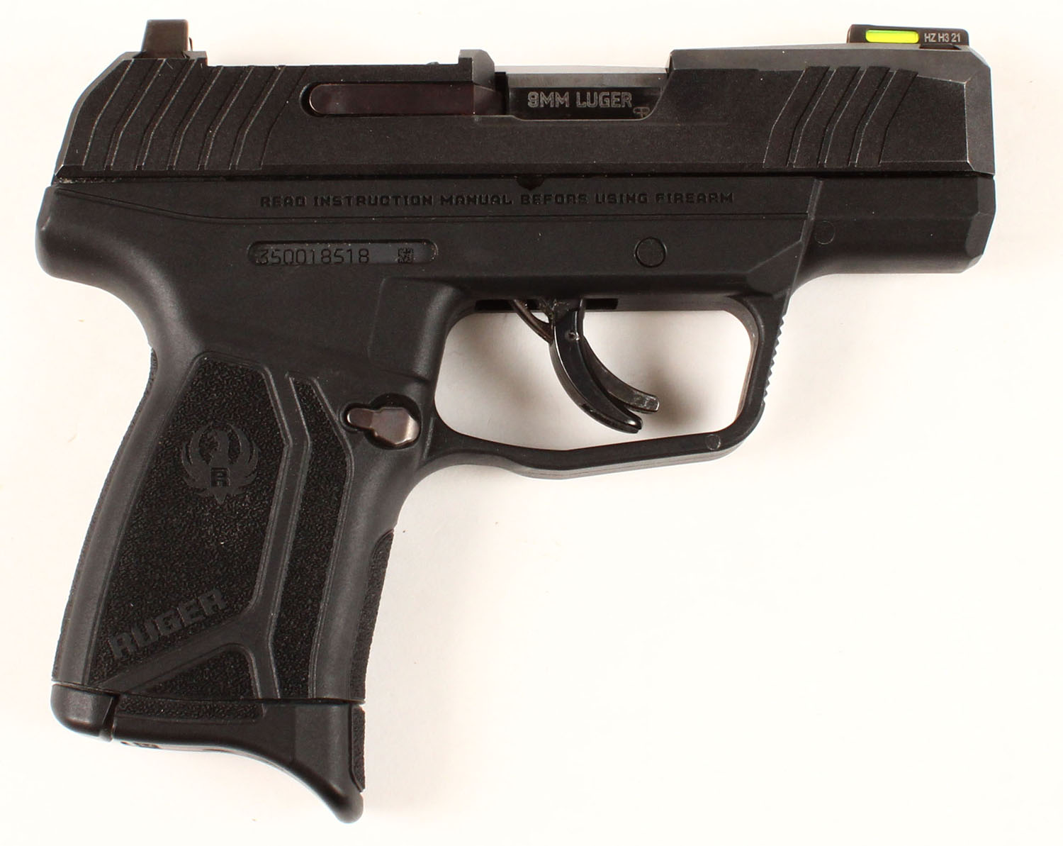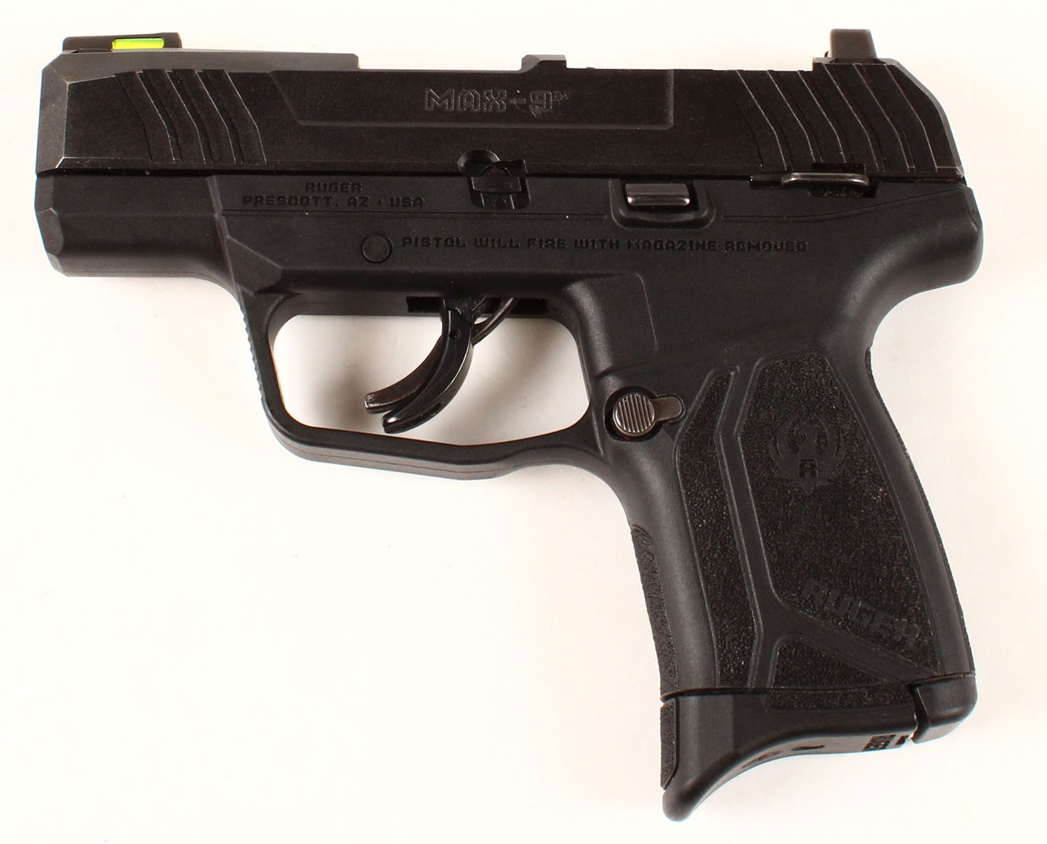 Ruger, MAX-9, CAL: 9mm, MFG: Modern, SN: 350018518, Semi Auto Pistol, 3 1/8'' barrel. The Ruger marked textured grip frame is excellent. The matte black finish on the slide is excellent, rating 99%. Bore is excellent. The slide carries an adjustable rear sight & green fiber optic day/night sight. The direct mounting optic plate is missing, with two open screw holes. Detachable 10rd mag. FFL Req. - Value: 350 to 450