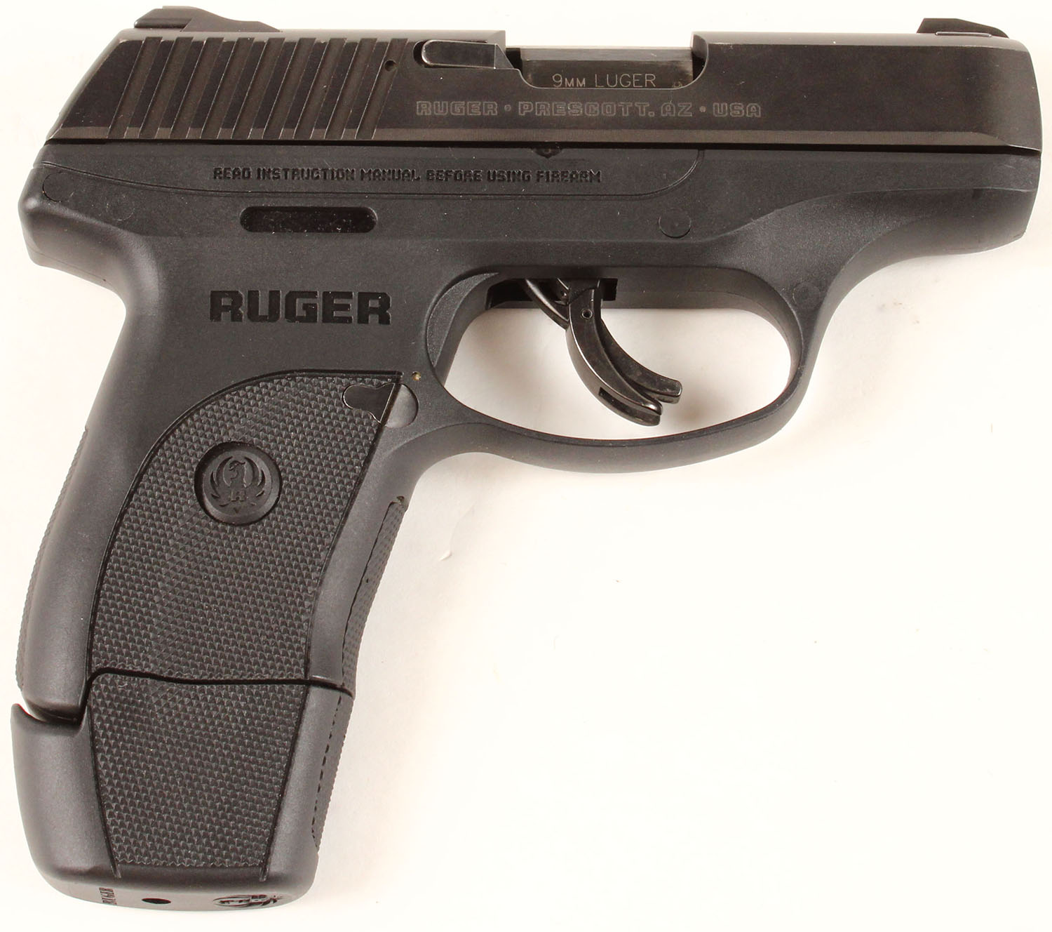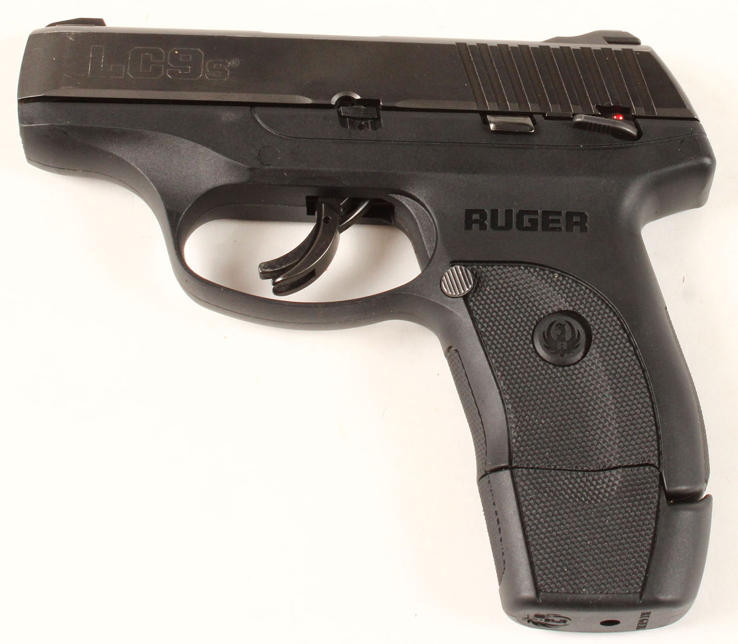 Ruger, LC9s, CAL: 9mm, MFG: Modern, SN: 451-19616, Semi Auto Pistol, 3 1/8'' barrel. The Ruger marked textured grip frame is excellent, with minor handling marks. The matte black finish on the slide is excellent, rating 98% overall. Bore is excellent. The slide carries a white two-dot rear sight & single dot front sight. Detachable 7rd mag, with grip extension. FFL Req. - Value: 250 to 400