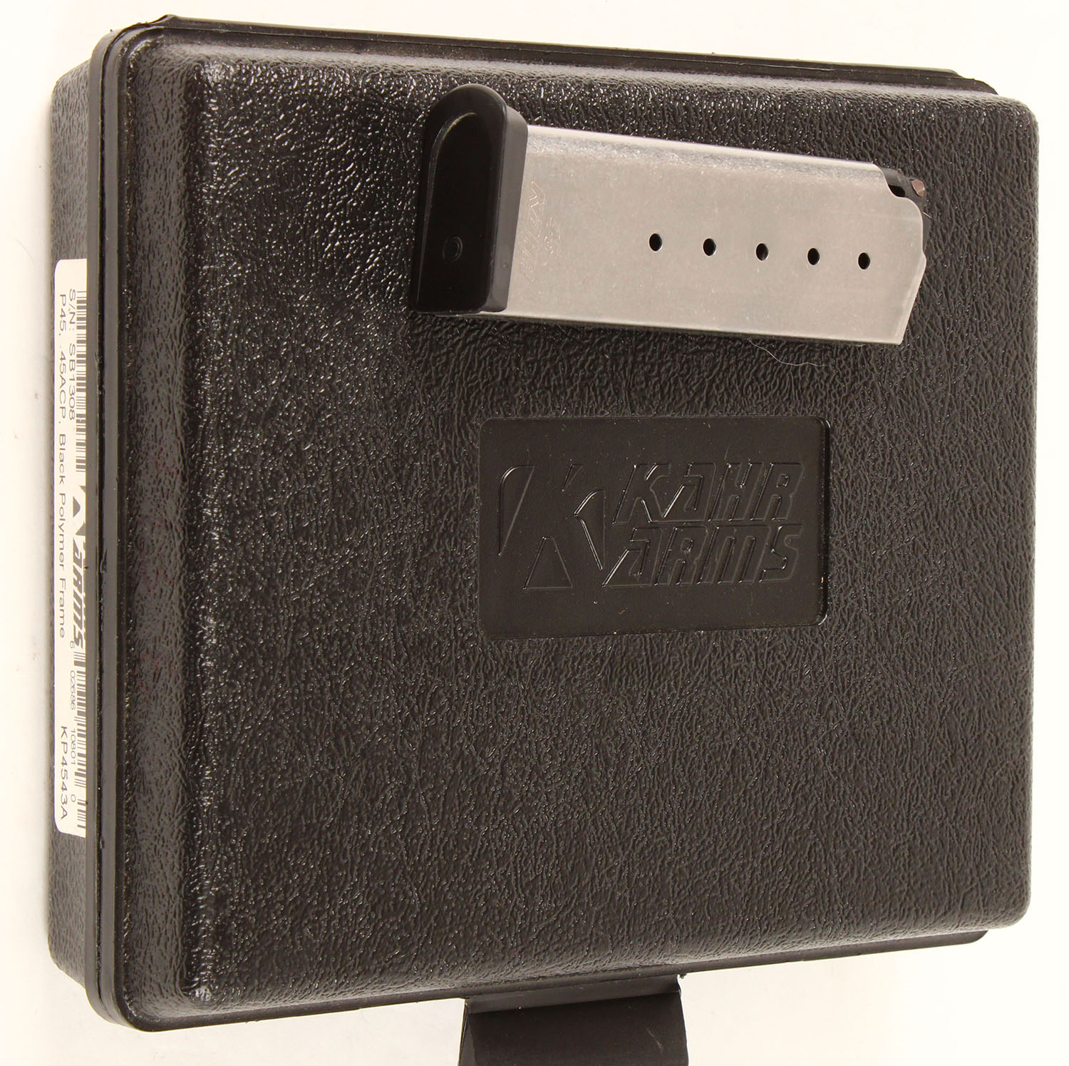 CASED Kahr Arms, Model P45, CAL: 45 ACP, MFG: Modern, SN: SB1308, Semi Auto, Double Action Only Pistol, 3 1/2'' barrel. The textured polymer grip frame is excellent, with light handling marks. The stainless steel finish on the slide is excellent. Bore is excellent. Dovetailed white bar rear sight & white dot front sight. A more economical alternative to many more expensive pistols, yet still a good quality gun in the popular caliber. Comes in its original hard case, with a second factory mag & operating manual. FFL Req. - Value: 400 to 800