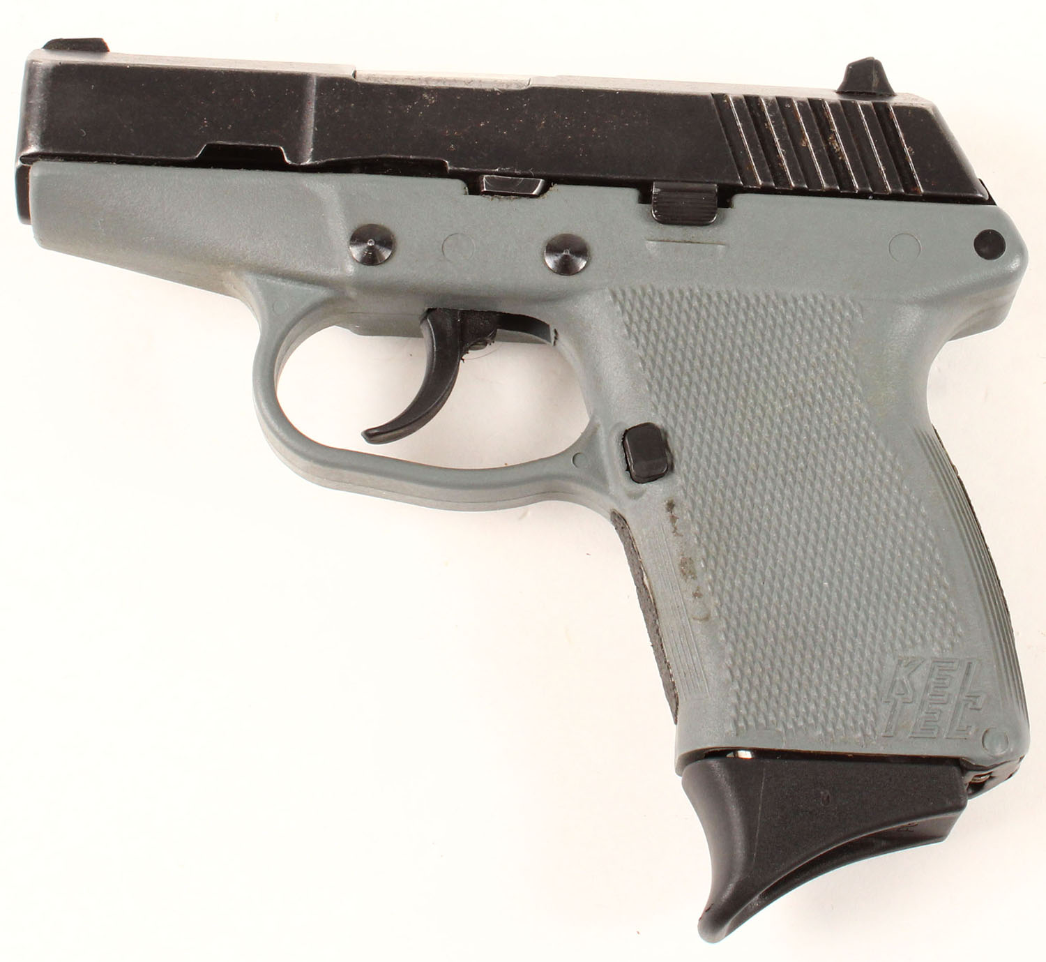 Kel-Tec, Model P-11, CAL: 9mm, MFG: Modern, SN: AA4B22, Semi Auto Pistol, 3'' barrel. The grey, Kel-Tec marked checkered polymer grip frame is very good, with handling marks, light scrapes & small areas of slight discoloration. The matte black finish on the slide rates 85% overall, with spotting, speckling & edge wear toned to metal grey. Bore is excellent. The slide holds a white two-dot rear sight & single dot front sight. The right side of the frame holds a screw-in belt clip for concealed carry. 12rd detachable mag, with grip extension. FFL Req. - Value: 150 to 250