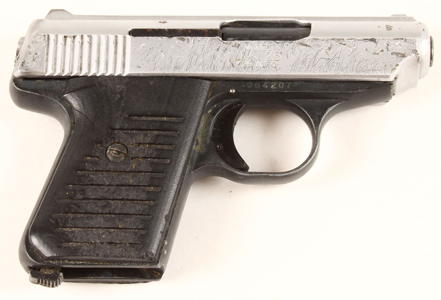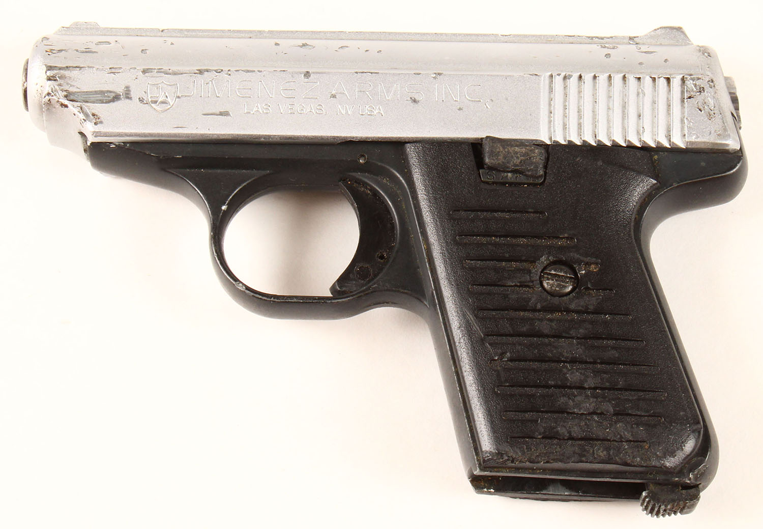 Jimenez Arms, Model JA 25, CAL: 25 Auto, MFG: Modern, SN: 064207, Semi Auto Pistol, 2 1/2'' barrel. The textured polymer grips are good & solid, but does have a crack from the rear edge to the screw on the right grip & they display lots of scrapes & wear. The stainless steel finish on the slide is good, but also with lots of nicks & abrasions. The black finish on the frame is excellent. Bore is very good. Factory sights. Missing the mag. FFL Req. - Value: 20 to 100