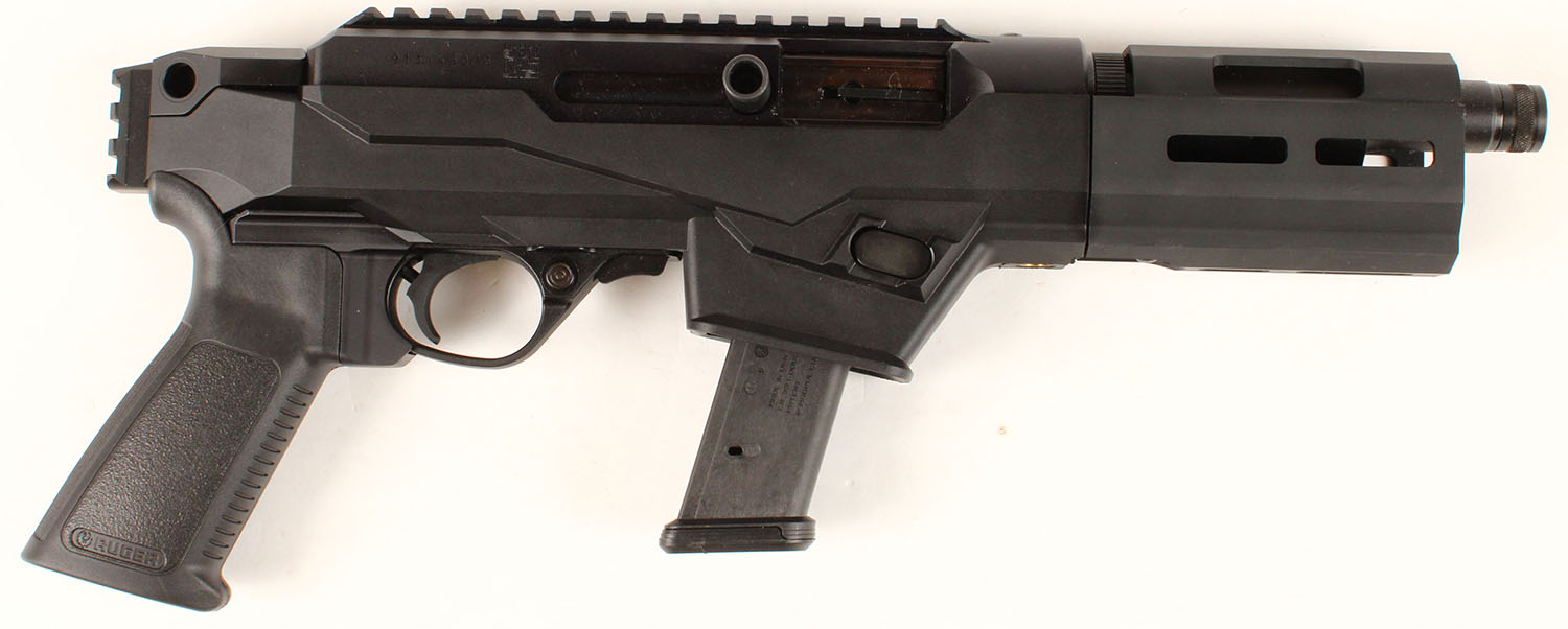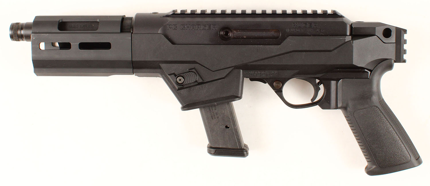 Ruger, PC Charger, CAL 9mm, MFG: Modern, SN: 913-46076, Semi-Auto Pistol, 6 1/2'' barrel, Cold hammer-forged, chrome-moly steel barrel with ultra-precise rifling. The synthetic textured grip is excellent. The factory Type III Hard-Coat Anodized black finish rates 99% overall. CNC-machined from an aerospace grade 7075-T6 aluminum billet. Bore is excellent. The receiver includes an integrated Picatinny-style rail for accessories & optics. Integrated rear 7075-T6 aluminum picatinny rail for brace mounts. Reversible magazine release & reversible charging handle. A customizeable & versatile pistol. FFL Req. - Value: 500 to 750