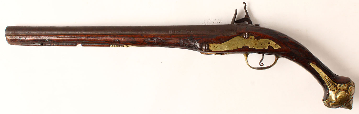 Percussion Pistol, CAL: Approx 16mm, MFG: Consignor indicates early 1700's, SN: N/A, Single Shot Black Powder Muzzleloader Pistol, 13'' barrel. The original hand carved & ornate full length stock is fair. It has a broken missing chunk from in front of trigger guard & a missing sliver from the muzzle end. Stock carries a brass buttend, brass trigger guard, brass side plate & brass front accent piece. The metal finish is a dark brown patina. Bore is good. The barrel holds no sights. Hammer & trigger do function, but with weak spring from due to stock break. Black Powder, Antique, No FFL Req. - Value: 100 to 350