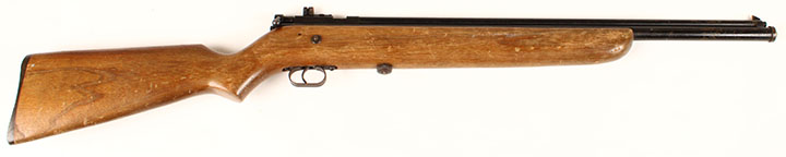 Crosman Model 114, .22 Cal., wood stock shows light wear, black finish shows some wear. Grade: Very Good ++ - Value: 40 to 100