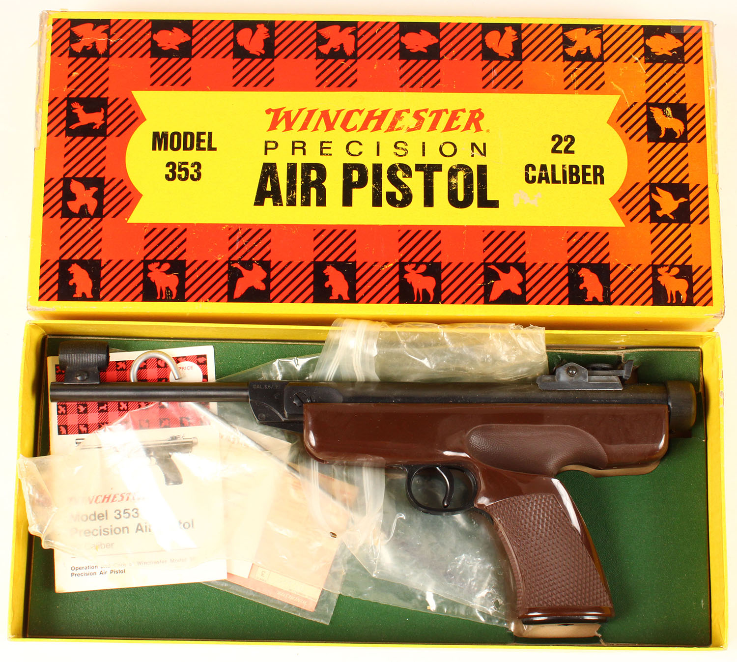 Winchester Model 353, .22 Cal Precision Air Pistol, target grips, brown plastic stock, single brake action, adj. rear sight, hooded front sight, nice original box swith paperwork. Grade: Excellent + - Value: 40 to 150