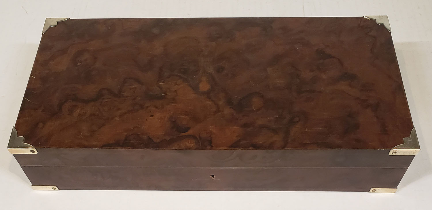 Fantastic Burl wood semi-automatic pistol case. Comes with brass corner pieces, green velvet interior, brass oil bottle, key for lock which works, & a leather lable. Overall condition is excellent. - Value: 150 to 300