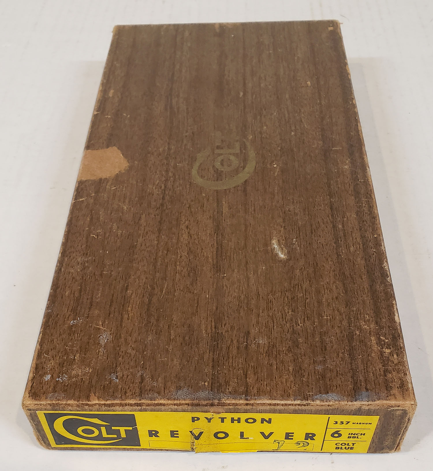 BOX ONLY: Colt Python revolver wood grain box with red interior from 1965-73. Lable indicates this is for a 6'' barrel & blued example. Comes with original Colt phamphlet inside. Corners are solid, with some rub wear. Overall condition is very good. - Value: 20 to 100