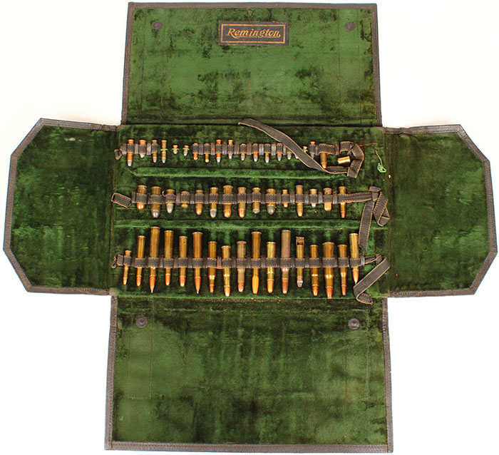 RARE! Remington. large salesman sample bag with various different cartridges, nearly full missing only one, felt on the inside is nice, the outside of the bag is in very good condition but missing both straps, measures 24'' x 24'' unrolled. Grade: Very Good ++ - Value: 200 to 2000