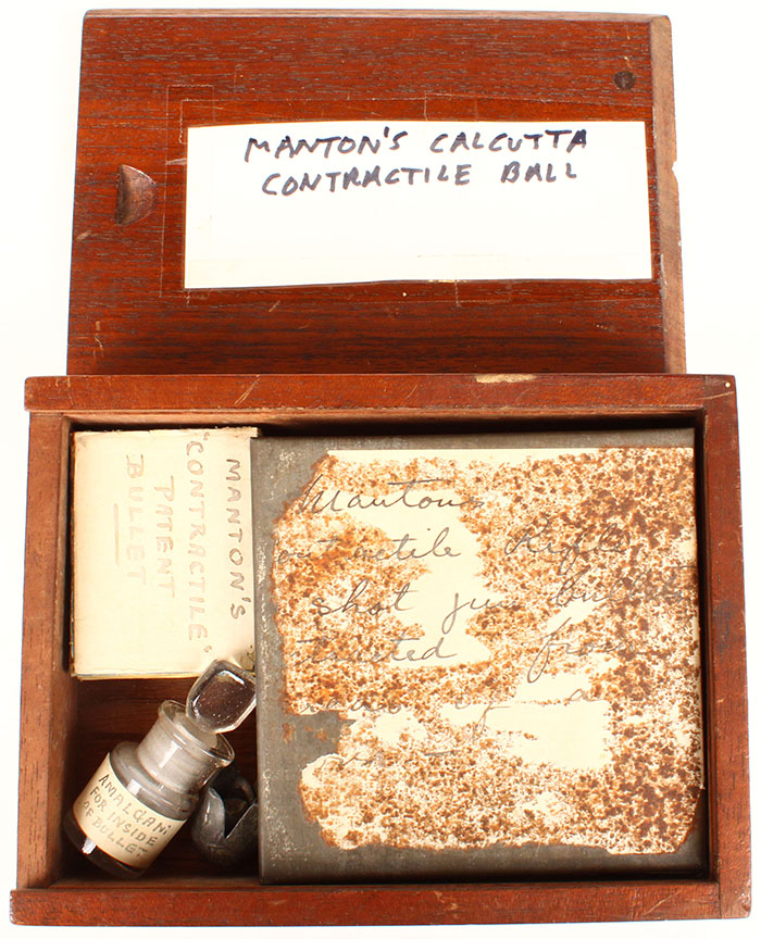 Manton's Calcutta Contractile Ball, has many bullets after being fired, has so has a glass bottle of Amalgam for use in side of bullet. Grade: Very Good ++ - Value: 20 to 200