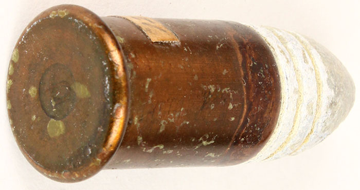 56-56 Spencer. HS=Raised U. Case length: .880. Bullet Dia.: .538 . Lead pointed with 2 visible grooves. Grade: Excellent - Value: 100 to 300