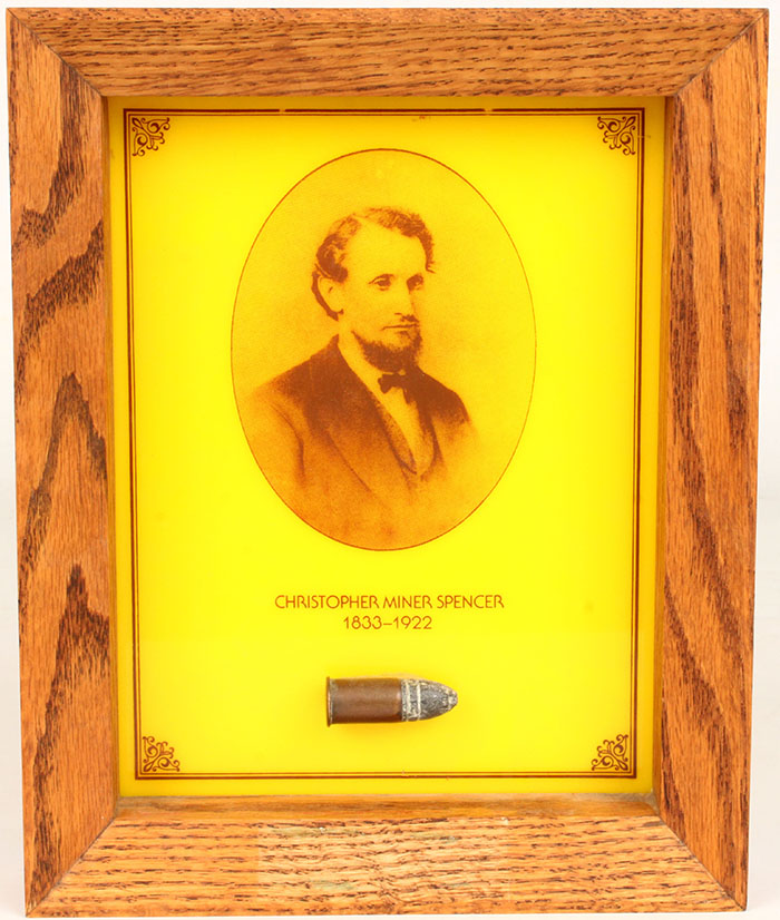 | 56-56 Christopher Miner Spencer Cartridge in a frame. Grade: Ex...