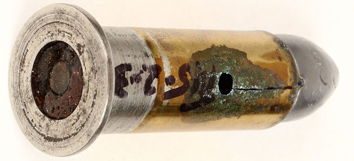 .54 Morse Type 2: NHS, steel base & brass body (stained) 1.583'', lead bullet. Case has one hole 1/3 way down case and a crack from the case mouth to hole. Possible reload. Grade: Very Good ++ - Value: 100 to 200