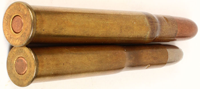 Lot of 2. (1) .450 #2 Nitro Express--3.5'' case. HS:''KYNOCH 450 No2 NITRO''. RN CJ FMJ. (1) 450/400 x 3.25'' case. HS:''KYNOCH 450/400 NITRO''. RN CN SP. Grade: Excellent - Value: 10 to 60