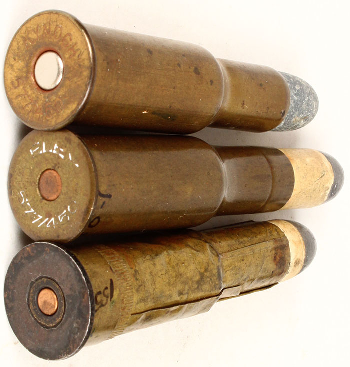 Lot of 3, 577-450 Martini Henry. All Commercial Loadings: (1) NHS, coiled case, rn white paper patch lead w/ copper tube, probable Eley loaded. (1) HS=''KYNOCH 577/450'', rn lead. (1) HS=''ELEY 577/450'', rn lead bullet with a large paper patch. Grade: Very Good ++ - Value: 10 to 100