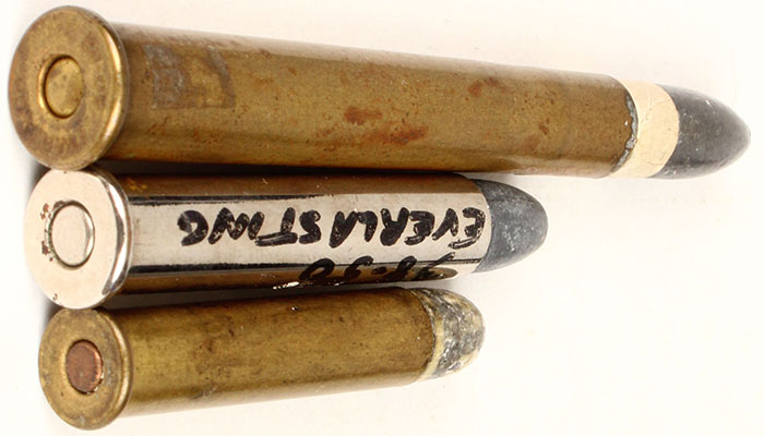 Lot of 3 Ballards. (1) 40-85 Ballard. HS=''W.R.A. Co. 40-85 BAL''. Lead paper patch flatnose. (1) 38-50 Ballard Everlasting. NHS. Lead flatnose, nickeled case. (1) 38-30 Extra Long Ballard. NHS. Lead roundnose. Grade: Excellent - Value: 20 to 40