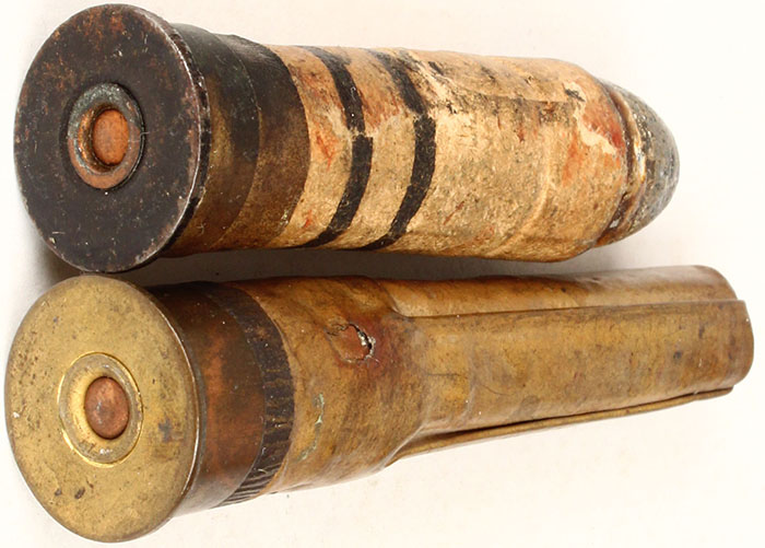 Lot of 2. (1) 577 Snider Mark VIII for rifle and carbine. NHS. Two black bands on paper over rolled brass case. RN Lead. (1) 476 India Police shot load. NHS. Probably made in Dum Dum, India. Grade: Very Good + - Value: 10 to 100
