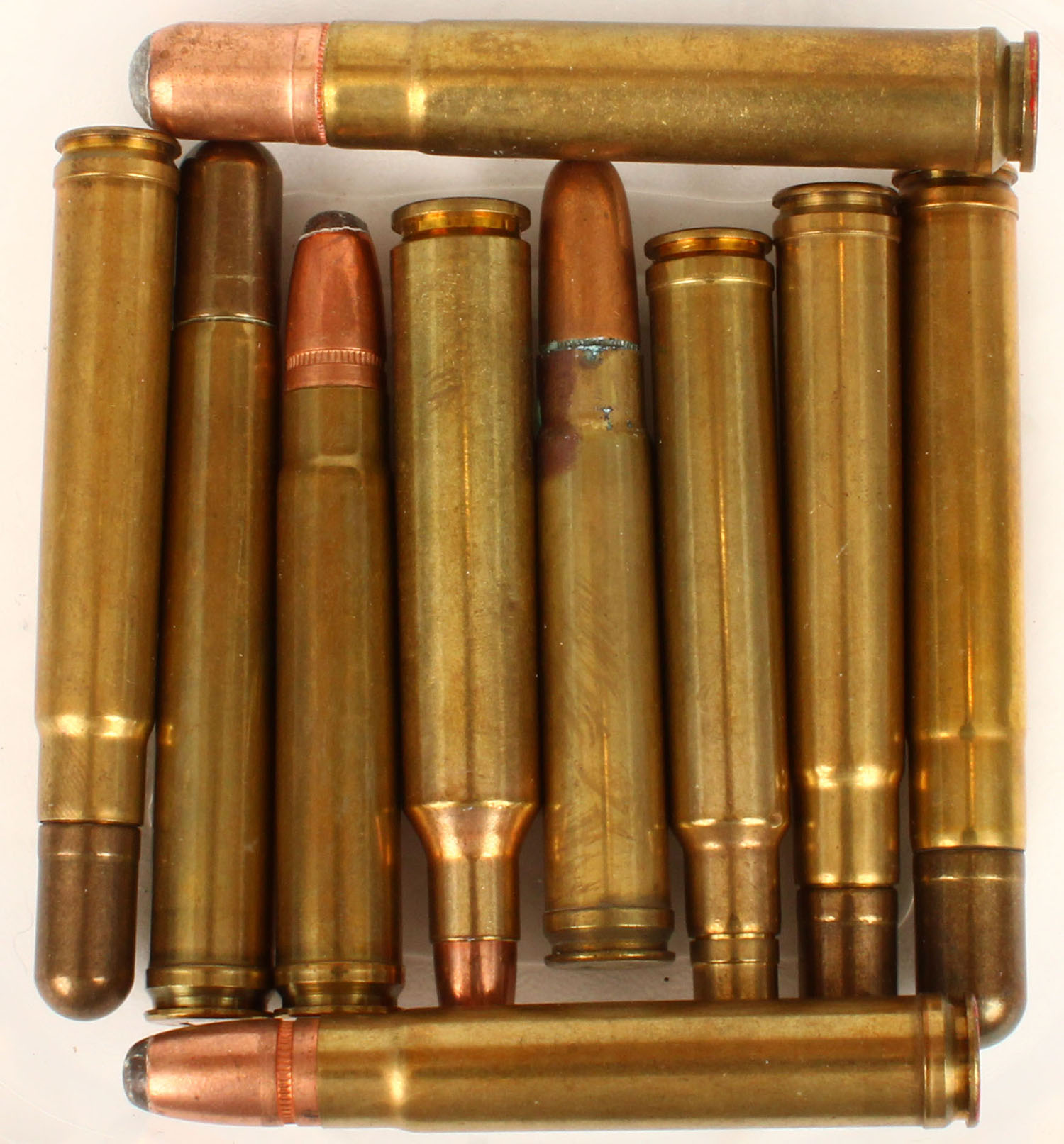 Lot of 10. A-Square Brand Ammunition. 1 each of the following calibers: 458 Lott, 450 Ackley, 416 Taylor, 500 A-Square (Proof), 338 Excalibur, 416 Hoffman, 416 Remington, 425 Express, 358 Shooting Times Alaskan (STA), 425 Express (Proof). Grade: Very Good ++ - Value: 40 to 80