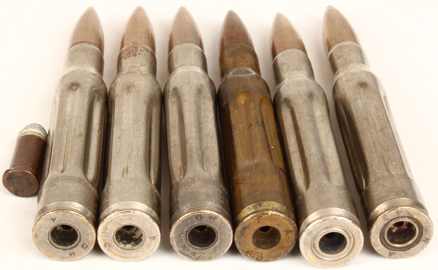 Lot of 7, (6) military dummy cartridges, (1) .25 Ethan Allen Lip Fire, mixed H/S. Grade: Very Good ++ - Value: 2 to 100