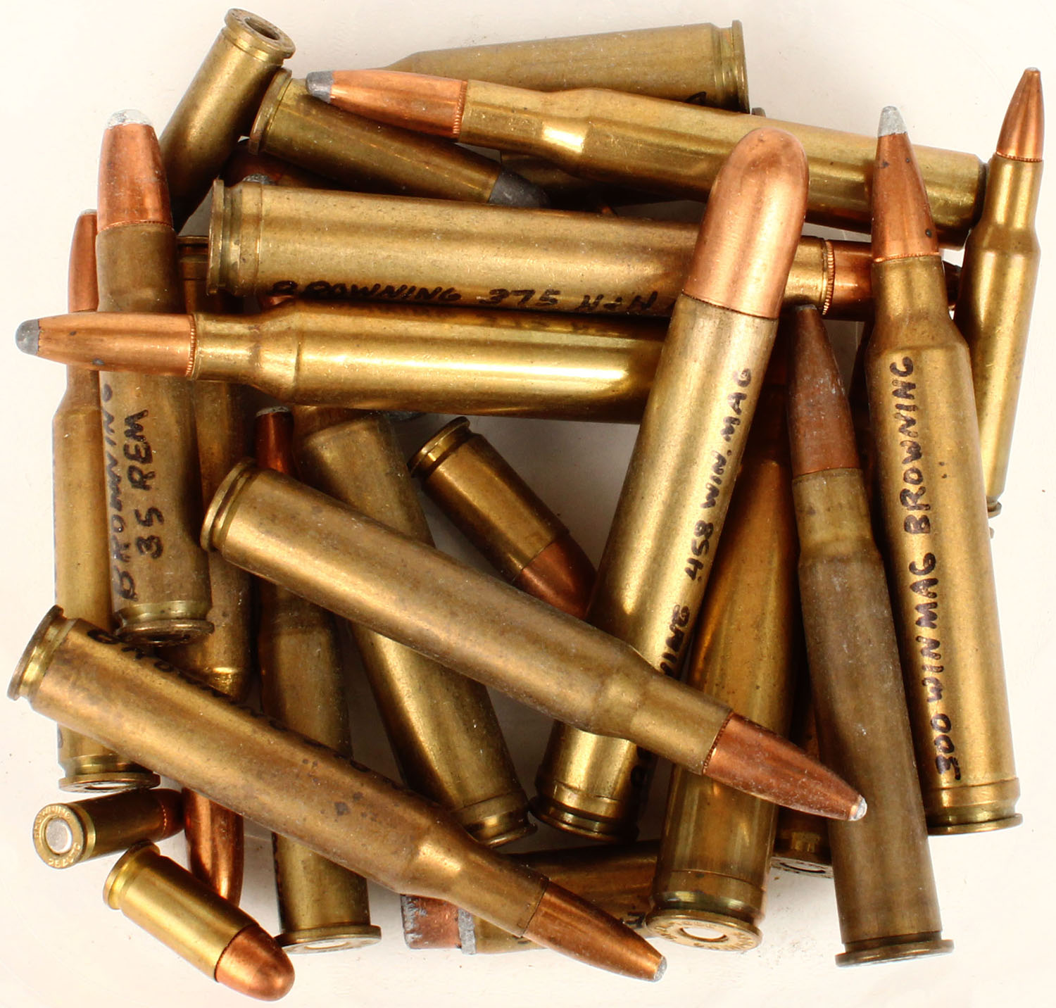 Lot of 28 Browning Rifle Pistol Cartridges, 18 Rifle from 222 REM to 458 WIN. MAG. 10 Pistol-Revolver 25 Auto to 45 AC. Grade: Excellent - Value: 2 to 100