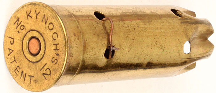 H/S: ''KYNOCH Patent'' 12 ga, empty brass shotshell, 2 1/2'' OAL. Grade: Excellent - Value: 6 to 60