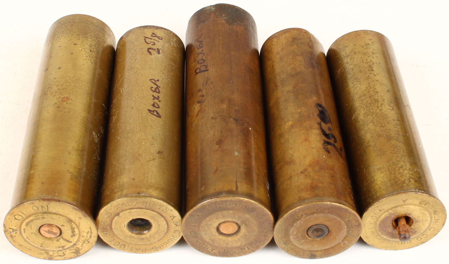 | Lot of 5 empty brass shotshells. Grade: Very Good ++ - Valu...