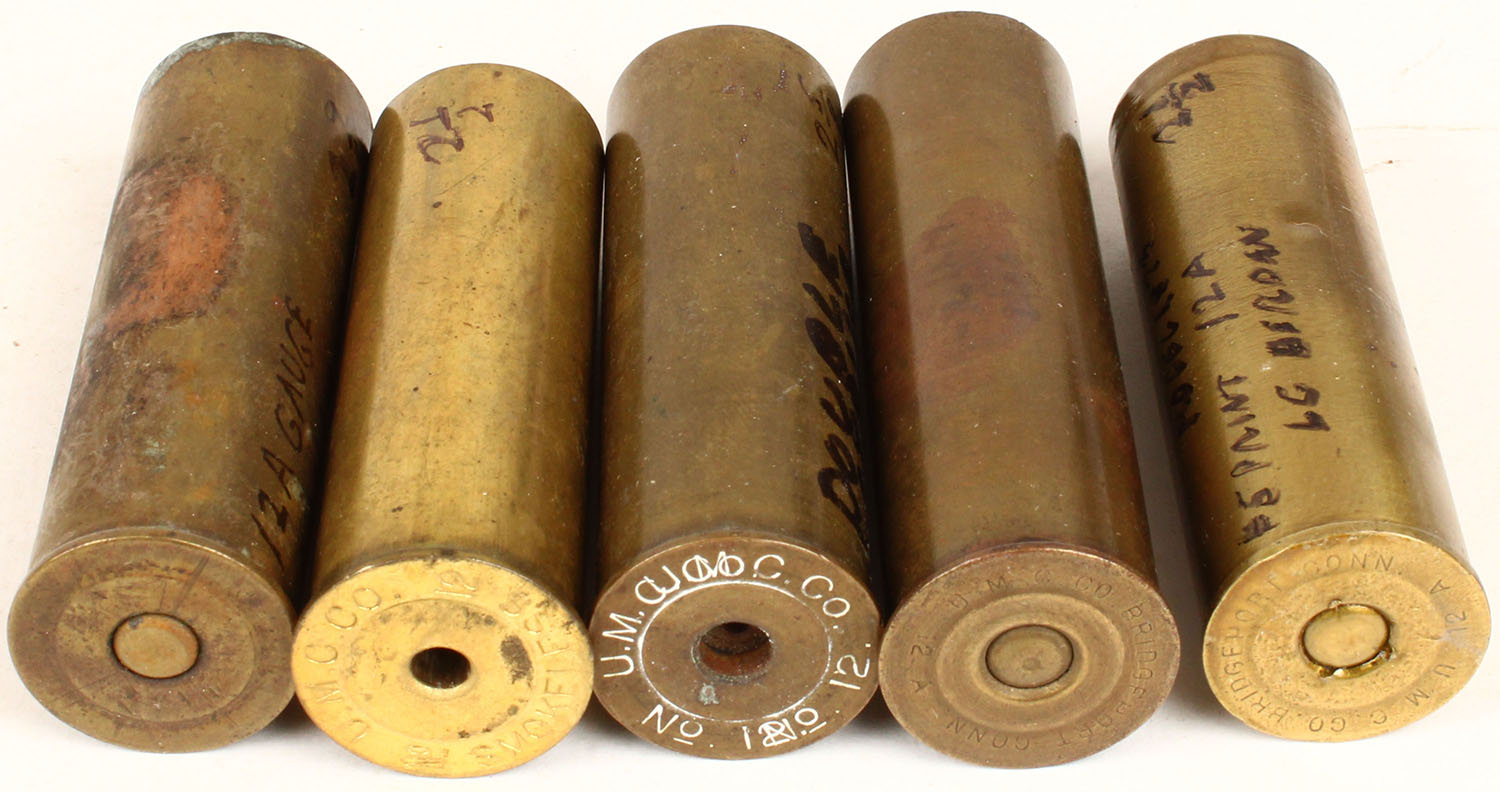 | Lot of 5 empty brass shotshells. Grade: Very Good ++ - Valu...