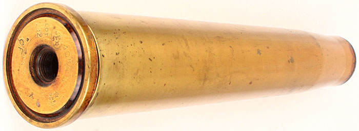 British, 40mm shell, H/S ''40M/M IV +'', ''LOT 92'', ''U 90'', ''1943'', ''E.B.'', ''CF'', star over ''DAF P.I.'' in circle, star over ''DAF 2'' in circle, OAL-12 1/4''. Grade: Excellent - Value: 10 to 100