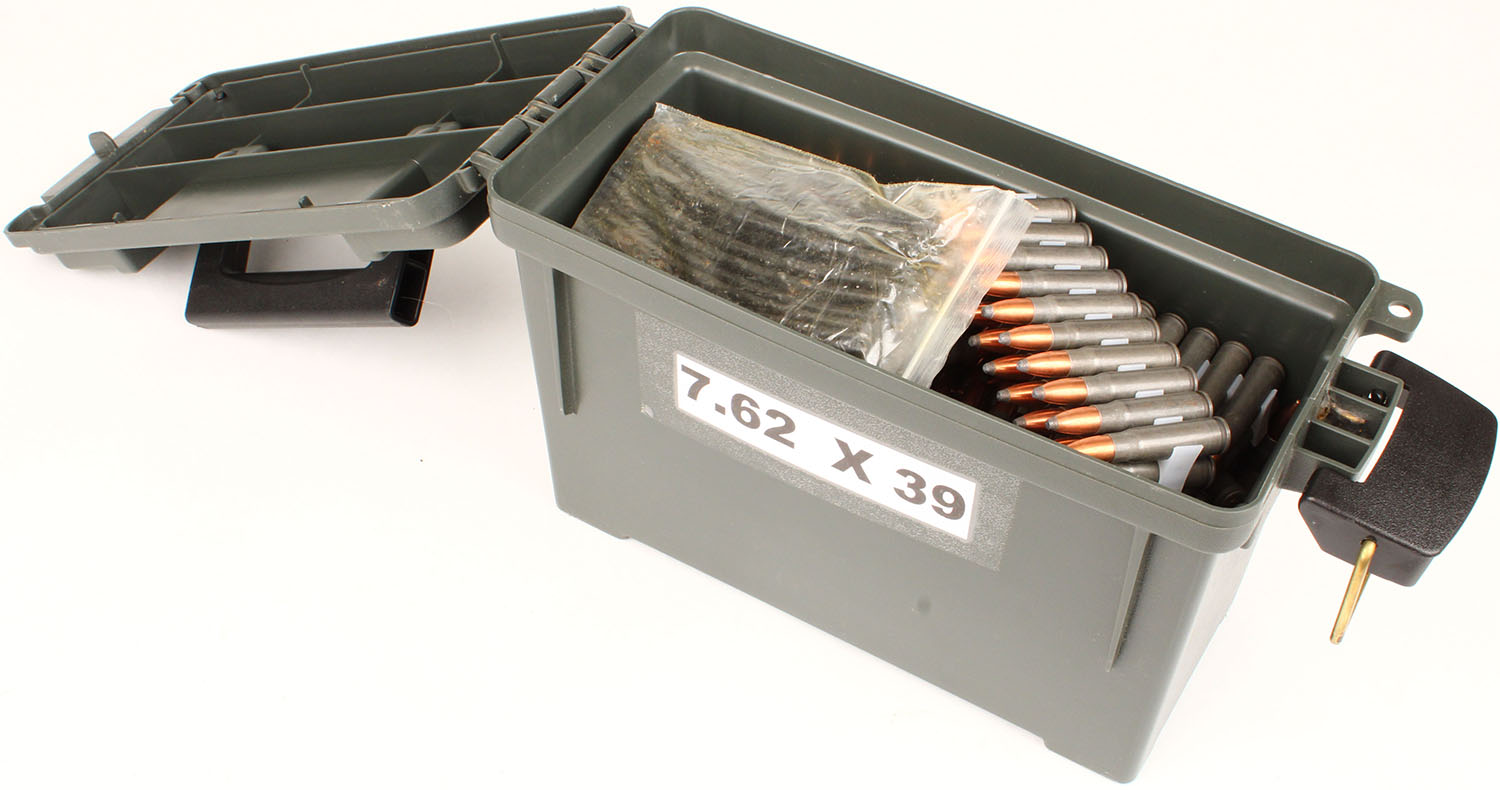 Plastic ammo can Full of Approx. 400 Rds. Of steel case 7.62x39 Tulammo Soft Point, ammo is excellent. Grade: Excellent - Value: 200 to 400
