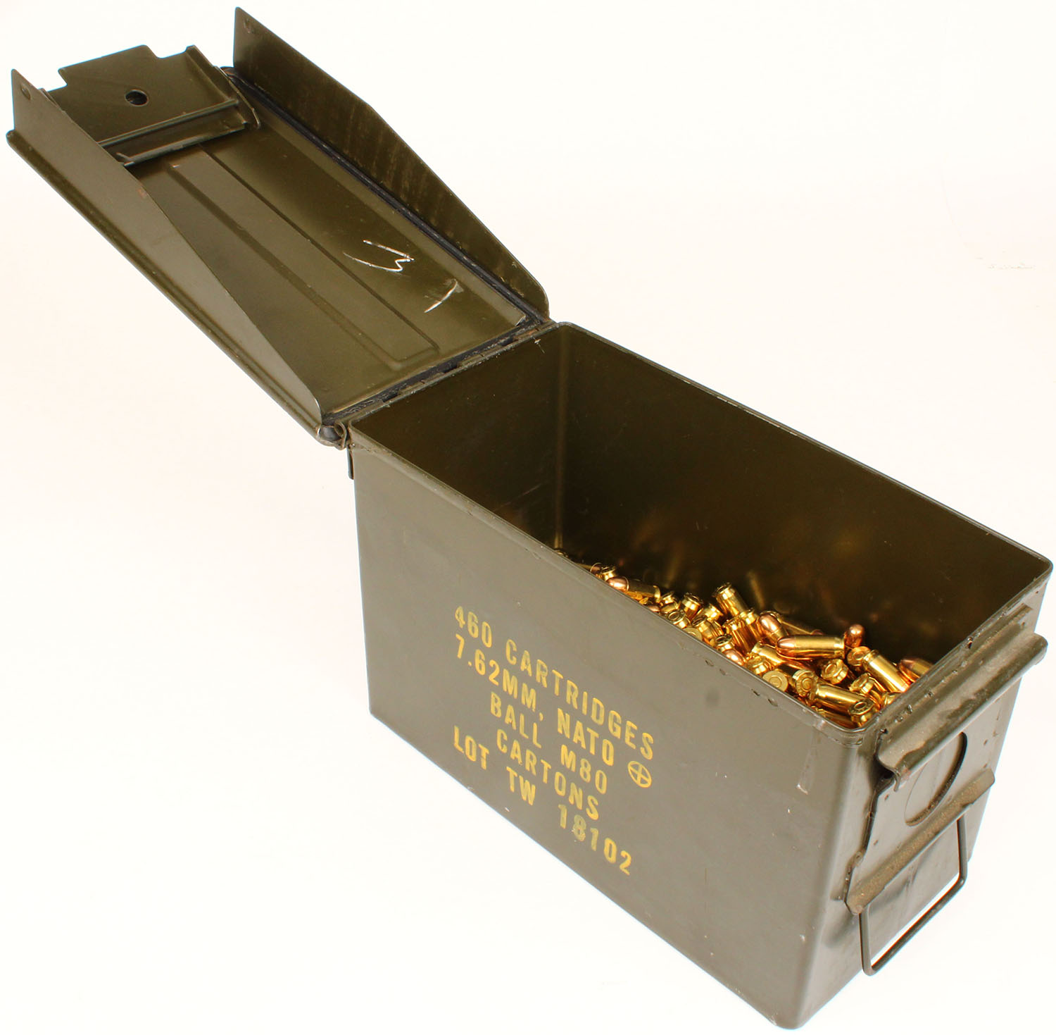 Military ammo can, half full of CBC marked FMJ .45 ACP, ammo is excellent. Grade: Excellent - Value: 50 to 200